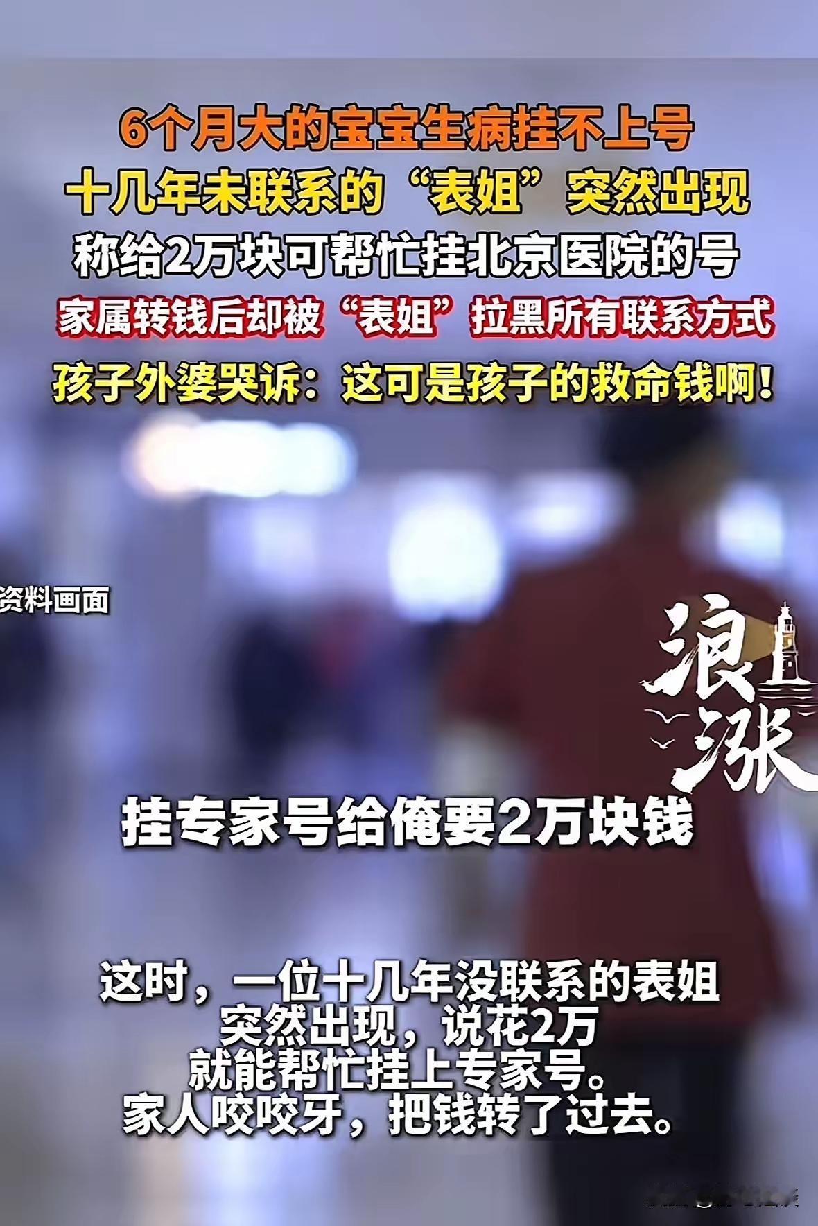 河南平顶山,6个月大的男宝生病,急需挂北京专家号诊治,就在妈妈不知所措的时候,十几年没联系过的表姐突然联系上她,说拿2万块钱就可以给挂上,看着怀里生病的孩子,她一刻都等不了,咬牙凑了2万块钱给转过去,万万没想到,表姐把钱收完立马把他们的联系方式全部删除并拉黑,所有人都联系不上他,孩子外婆崩溃大哭:那是孩子的救命钱,怎么忍心骗走!网友:这亲戚以后肯定是做不成了! 这个表姐哪是什么雪中送炭,分明是披着羊皮的豺狼。她专挑人最脆弱、最慌张的时候下手,精准拿捏住了家属“病急乱投医”的心理。孩子手臂都抬不起来了,全家急得团团转,这时候有人递过来一根稻草,谁还顾得上分辨是真是假? 这种趁你病要你命的行径,已经超越了道德败坏的范畴。两万块钱,对普通家庭来说是牙缝里挤出来的血汗钱,是孩子在北京活下去的希望。她轻飘飘一句“我有关系”,就把这钱装进了自己口袋,转身拉黑,这心是什么做的? 十几年没联系,一联系就来“送温暖”,这本身就是最大的破绽。真正的亲情哪怕平时疏于走动,在听到对方遭难时,第一反应是担心和帮助,而不是明码标价。这种连孩子救命钱都敢吞的人,眼里早就没有亲戚二字了。 有人说她这是诈骗,没错,从法律上讲这就是赤裸裸的诈骗罪。虚构事实,非法占有,数额也不小,等着她的不仅是良心的谴责,更可能是法律的铁窗。只是可怜了那个躺在家里难受的婴儿,他不懂大人们的算计,只知道病痛折磨着自己。 外婆的哭声听得人心里发颤,那不仅是丢了两万块钱的绝望,更是被至亲在背后捅刀子的寒心。这种痛,比孩子生病更让人难以承受。她或许这辈子都想不通,为什么血脉相连的人,能做出这么绝情的事。 全网都在骂这个表姐,说她缺德、没人性。确实,这年头骗子虽多,但专挑亲戚下手的,尤其是挑重病婴儿下手的,简直是突破了人类道德的底线。这种钱就算拿到手,她晚上能睡得着觉吗?不怕做噩梦吗? 这件事也给所有着急看病的家庭敲响了警钟。正规医院的专家号虽然难挂,但那是公平透明的。那些躲在暗处号称“有关系”的黄牛和骗子,利用的就是你的焦虑。病急也不能乱投医,否则就是雪上加霜。 现在唯一的指望就是警方能快点行动,根据转账记录把这个人揪出来。钱哪怕追回来一分,对孩子来说都是多一分生机。至于那个表姐,等她花光这两万块钱的时候,也就是她把自己送进监狱的时候。 看着怀里生病的孩子,再想想那个卷钱跑路的亲戚,这口气怎么咽得下?这不仅仅是钱的事,这是把人往绝路上逼。那个表姐大概以为拉黑了就万事大吉,殊不知天网恢恢,疏而不漏。 网友们说得对,这亲戚肯定是做不成了。岂止是做不成,这分明是结下了血海深仇。等孩子病好了,这笔账必须要算清楚。做人要是没了底线,连畜生都不如。 各位读者你们怎么看?欢迎在评论区讨论。