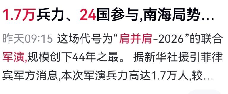 1.7万军演压境?菲防长喊话,中方以智取胜赢尊重 4月24日,菲防长借"肩并肩"军演高调喊话,宣称中国"非法占据领土",将军演定义为"集体威慑"。此次军演规模创44年新高,7国参演、17国观察员围观,日本1400名自卫队携反舰导弹登岛实弹射击,引发菲律宾民众强烈抗议。 然实力差距一目了然:菲海军主力护卫舰仅3000吨,对比中国海警5000吨+的体量,差距显著。中方当即回击,斥其"信口雌黄、颠倒黑白",奉劝"好自为之",并明确警告域外势力玩火必自焚。与此同时,外长携防长走访东南亚,以务实合作构建和平纽带。一边逞强斗狠,一边深耕共赢,胜负自在人心! 对此,你怎么看? 南海局势 中菲关系 大国博弈