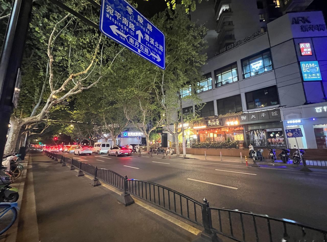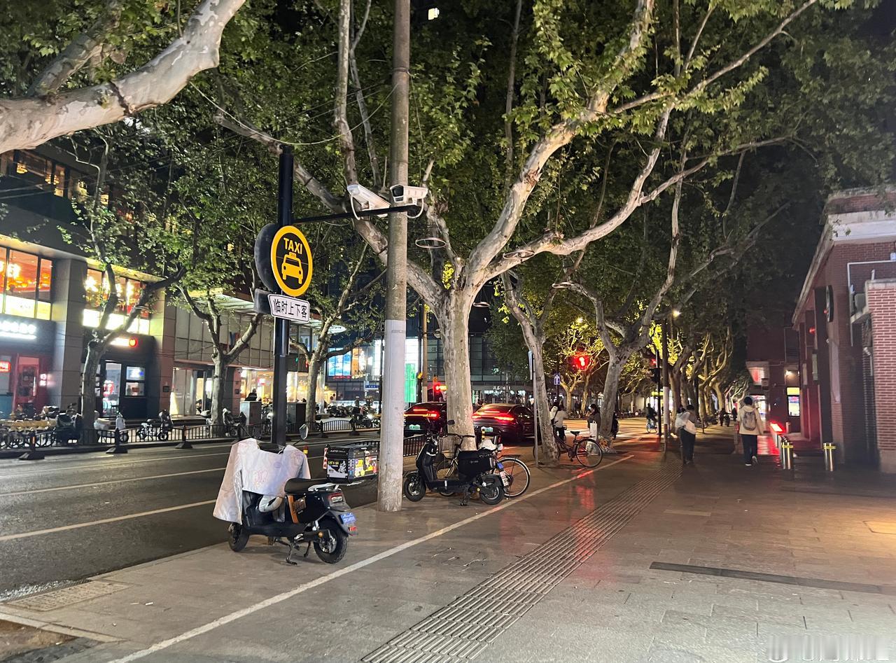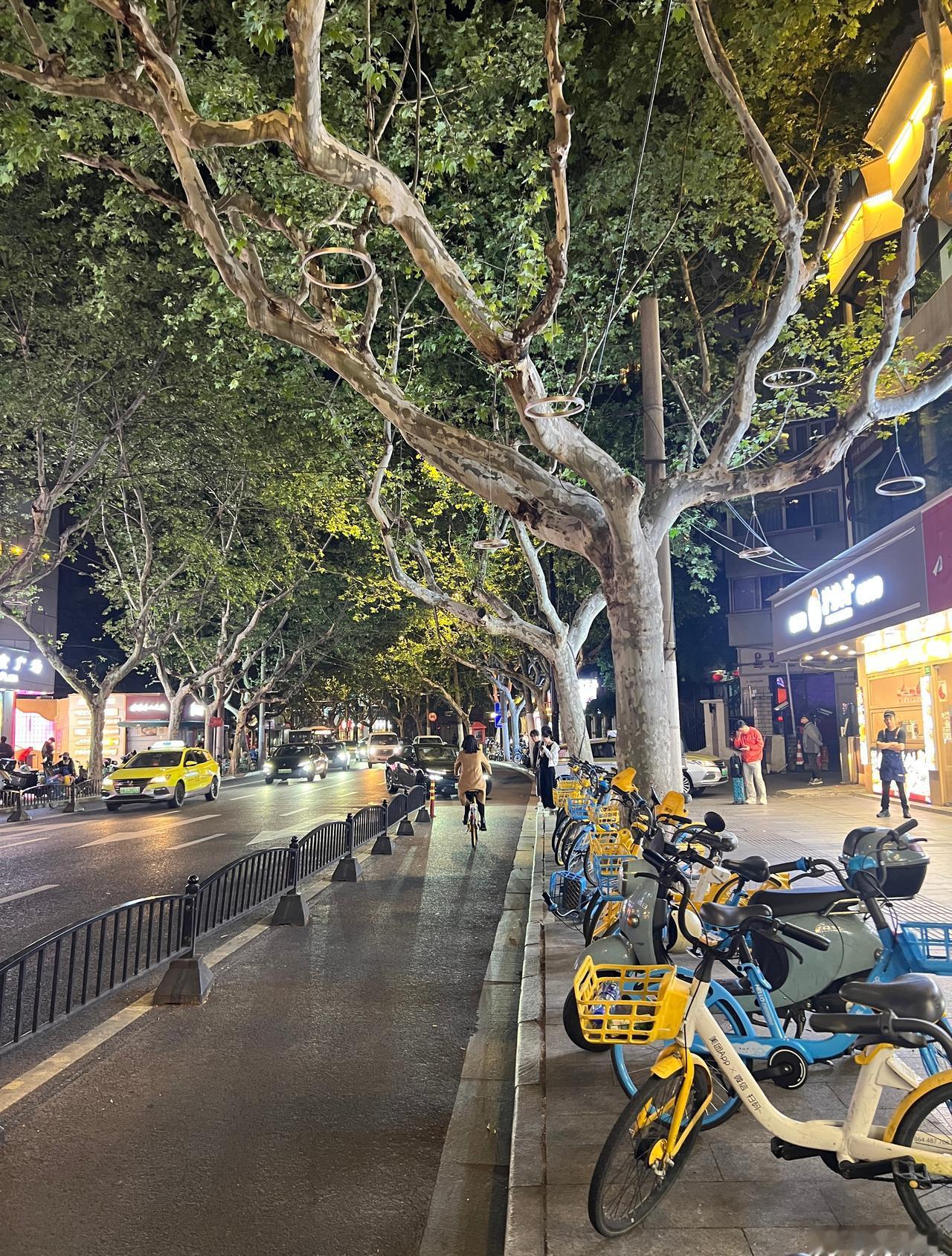 上海,天钥桥路微更新。 ●树冠茏盖的悬铃木是街道的灵魂,在高约3米-4米的部位分枝,在6米以上开叶,夏天遮阴冬天落叶,基本上解决了遮挡店招的问题。 ●街道旁林立的店铺是街道活力的来源,夜晚光照来源主要依靠店招与商铺本身的灯光即可,自然真实不做作。 ●人行道有基本的宽度,目测大约5—6米,基本解决电动车停放与人行基本宽度。 ●道路边无法停车,可能会使街道稍欠松弛感。 街道更新上海