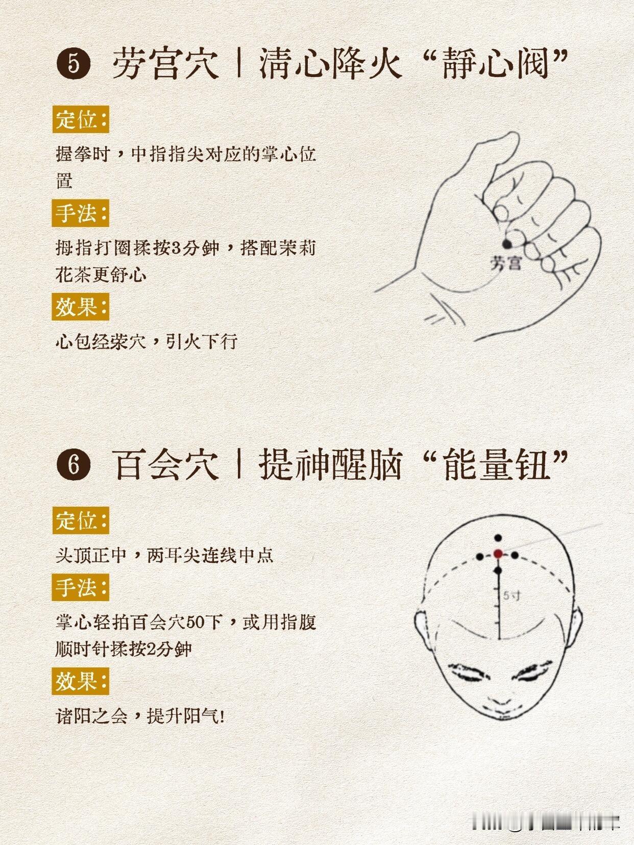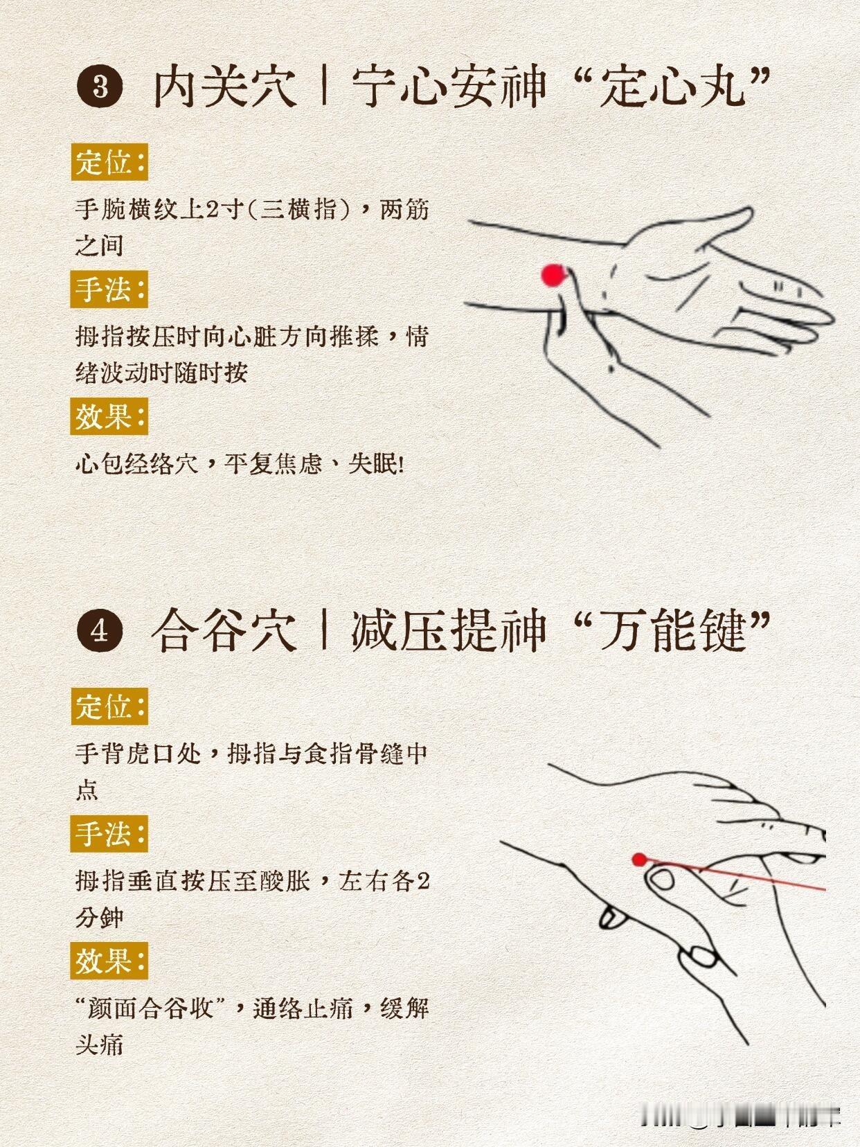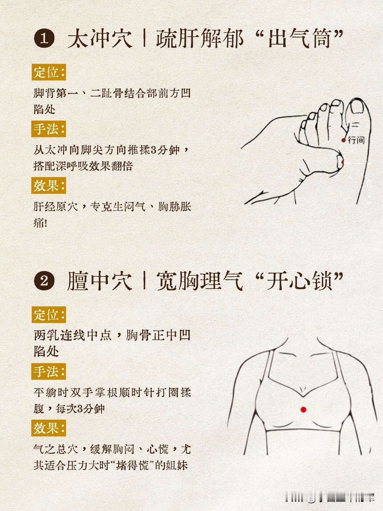 6个“随身小开关”,按完瞬间卸下情绪内耗 这几个穴位是我最近的解压神器,不管是上班烦躁、熬夜失眠,还是莫名胸闷,按一按都能快速找回状态,分享给同样被情绪内耗困扰的你。 1. 太冲穴 | 疏肝解郁“出气筒” 它在脚背第一、二趾骨结合部前方凹陷处,按的时候从太冲向脚尖方向推揉3分钟,配合深呼吸,生闷气、胸胁胀痛的时候按,感觉堵在胸口的那股气都顺了不少。 2. 膻中穴 | 宽胸理气“开心锁” 两乳连线的中点,平躺时用手掌根顺时针打圈揉腹3分钟,特别适合压力大到“堵得慌”的时候,揉完胸闷心慌的感觉会缓解很多。 3. 内关穴 | 宁心安神“定心丸” 手腕横纹往上三横指、两筋之间的位置,用拇指向心脏方向推揉,焦虑、失眠的时候随时按,能快速平复乱跳的心跳。 4. 合谷穴 | 减压提神“万能键” 手背虎口处,拇指和食指骨缝的中点,垂直按压到酸胀感,左右手各按2分钟,既能缓解头痛,又能在犯困的时候帮你提神。 5. 劳宫穴 | 清心降火“静心阀” 握拳时,中指指尖对着的掌心位置,用拇指打圈揉按3分钟,再配一杯茉莉花茶,心里的火气一下就降下去了。 6. 百会穴 | 提神醒脑“能量钮” 头顶正中间、两耳尖连线的中点,用掌心轻拍50下,或者用指腹顺时针揉按2分钟,早上起来按一按,能快速把阳气提起来,告别昏沉。 这些都是随手就能做的小动作,不用额外花时间,坚持按几天,整个人的状态都会清爽很多。