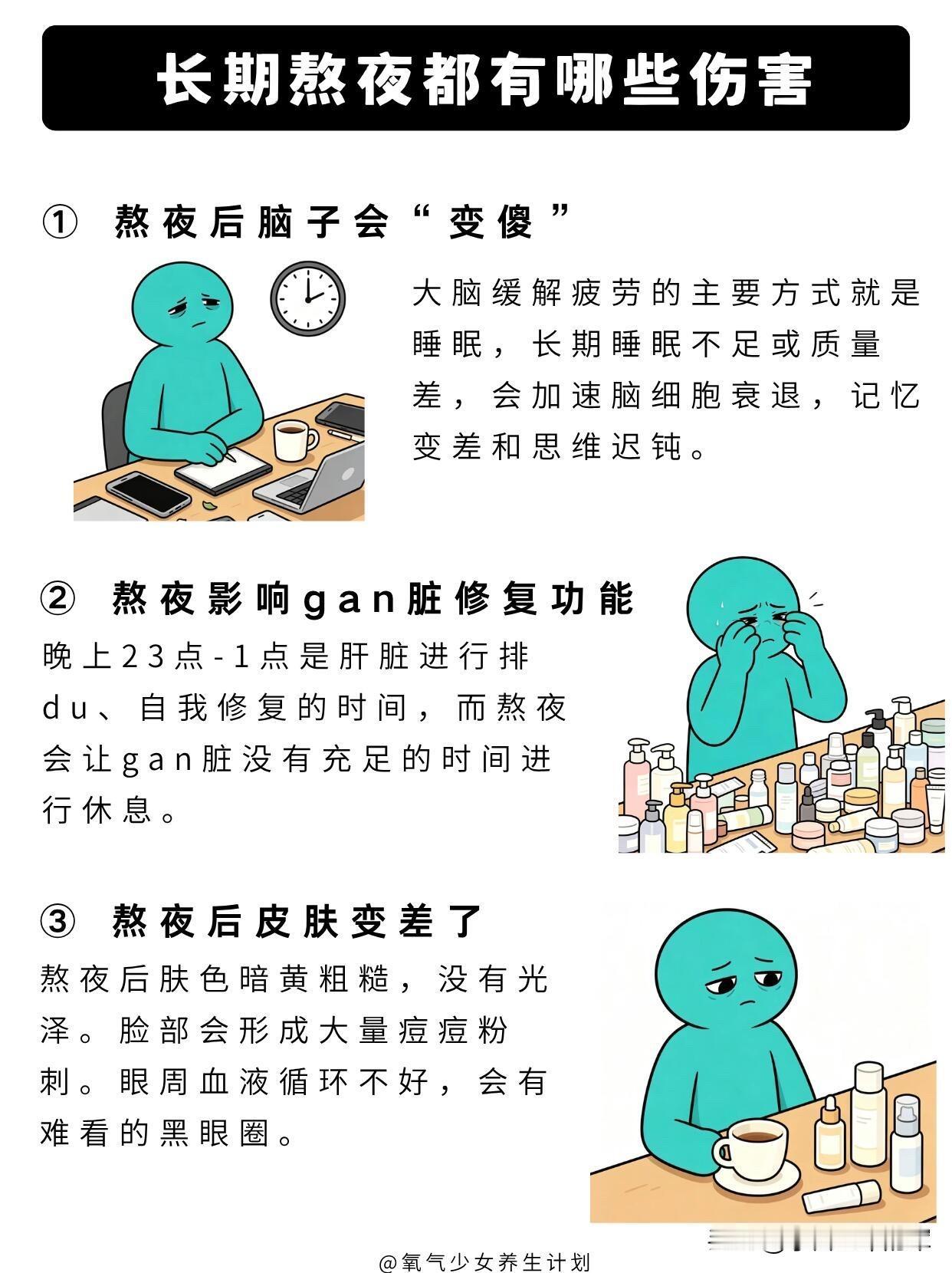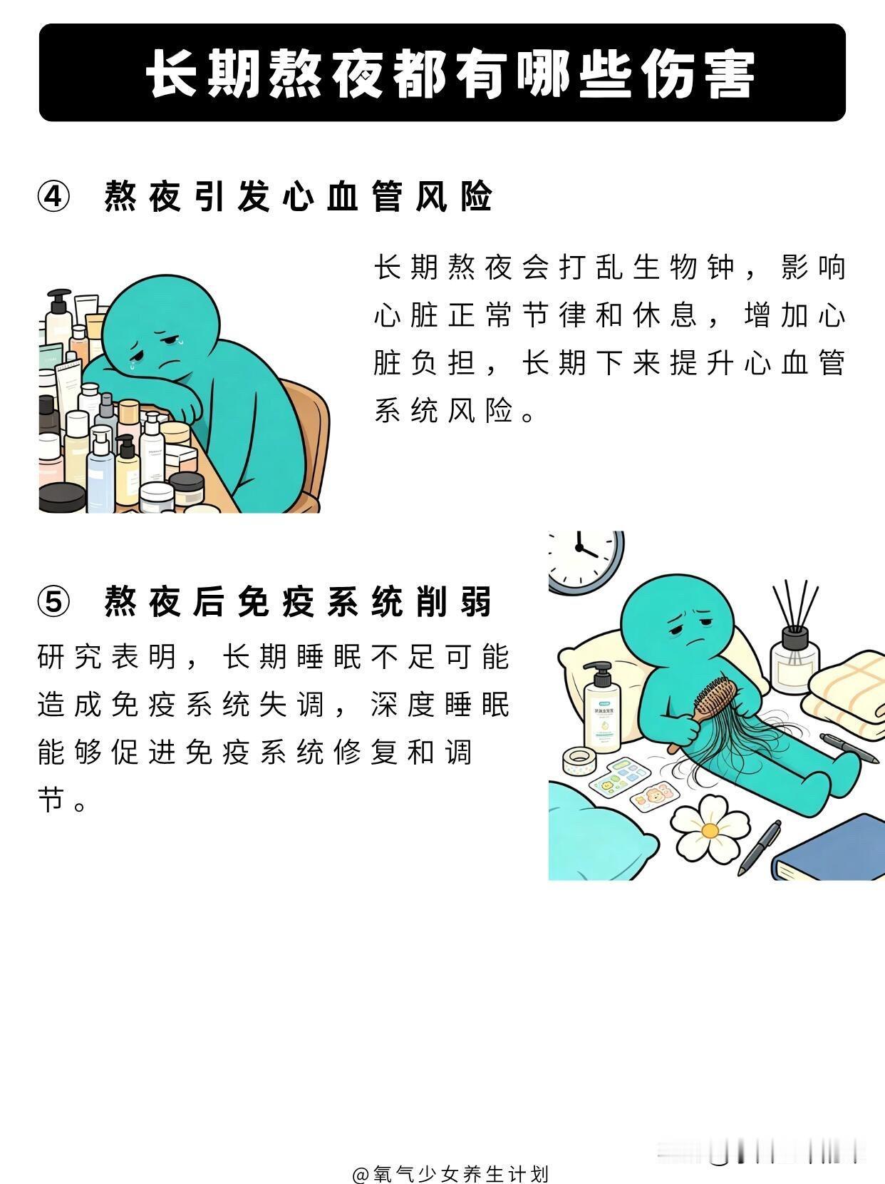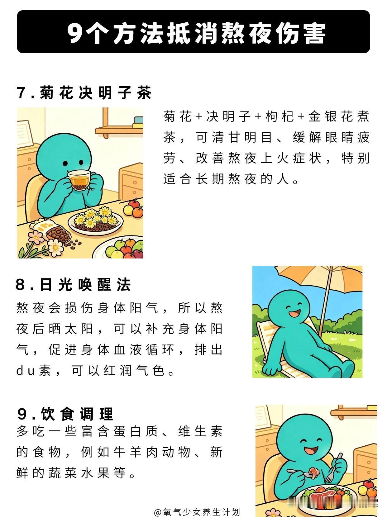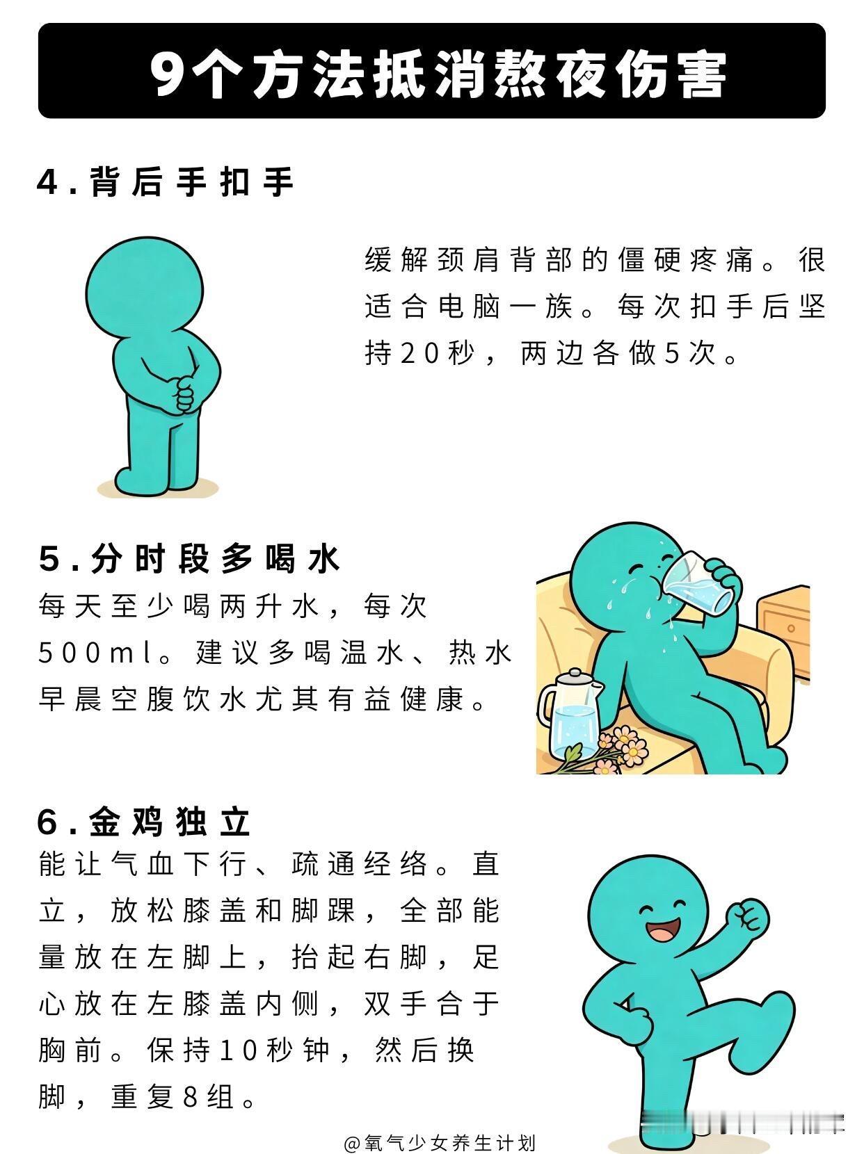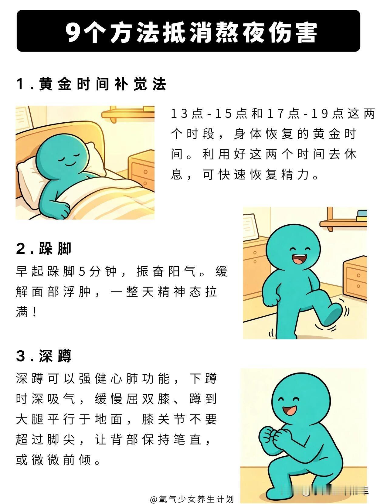 熬夜党自救指南!9个方法抵消熬夜伤害 熬夜的伤害真的不可逆,但这些方法能帮你把伤害降到最低,转给经常熬夜的朋友吧。 长期熬夜的危害先搞懂 1. 脑子变笨:长期睡眠不足会加速脑细胞衰退,记忆力变差、思维迟钝,反应都慢半拍。 2. 肝脏受损:晚上23点-1点是肝脏排毒修复的黄金时间,熬夜会让肝脏得不到休息。 3. 皮肤变差:熬夜后肤色暗黄粗糙,还容易爆痘长闭口,黑眼圈也越来越重。 4. 心血管风险:熬夜会打乱生物钟,加重心脏负担,长期下来会提升心血管系统风险。 5. 免疫力下降:长期睡眠不足会导致免疫系统失调,身体抵抗力越来越差。 9个抵消熬夜伤害的实用方法 1. 黄金时间补觉法 利用13点-15点、17点-19点这两个身体恢复的黄金时段休息,能快速恢复精力,缓解熬夜后的疲惫感。 2. 早起跺脚5分钟 早起跺脚可以振奋阳气,缓解熬夜后的面部浮肿,让你一整天都精神饱满。 3. 深蹲强健心肺 深蹲能锻炼心肺功能,下蹲时深吸气,蹲到大腿平行于地面,膝关节不超过脚尖,背部保持挺直即可。 4. 背后手扣手 缓解熬夜后颈肩背部的僵硬疼痛,每次扣手后坚持20秒,两边各做5次,很适合经常久坐的熬夜党。 5. 分时段多喝水 每天至少喝2升温水,每次500ml,早晨空腹喝水尤其有益,能帮助身体代谢,排出熬夜堆积的毒素。 6. 金鸡独立 能让气血下行、疏通经络,保持单脚站立10秒钟,然后换脚,重复8组,缓解熬夜后的气血不畅。 7. 菊花决明子茶 用菊花+决明子+枸杞+金银花煮茶喝,能清甘明目、缓解眼睛疲劳,改善熬夜上火的症状。 8. 日光唤醒法 熬夜后晒晒太阳,能补充身体阳气,促进血液循环,帮助排出毒素,改善熬夜后的暗沉气色。 9. 饮食调理 多吃富含蛋白质和维生素的食物,比如牛羊肉、新鲜的蔬菜水果,给熬夜后的身体补充营养。 这些方法只能帮你缓解熬夜伤害,最根本的还是尽量少熬夜,规律作息才是健康的王道。