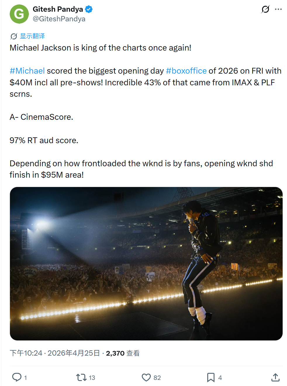TNABO 《迈克尔·杰克逊》北美首日劲收4000万美元,创下2026最好开映日表现,也是传记电影历史全新纪录;其中43%的收入来自IMAX在内的特效厅,可见不少观众是按照一部超级大片而非传统剧情传记片的期待入场。估计这周末三日本土开画将冲击9500万美元之高,大幅领先之前《冲出康普顿》保持的音乐传记片纪录(60.2M)