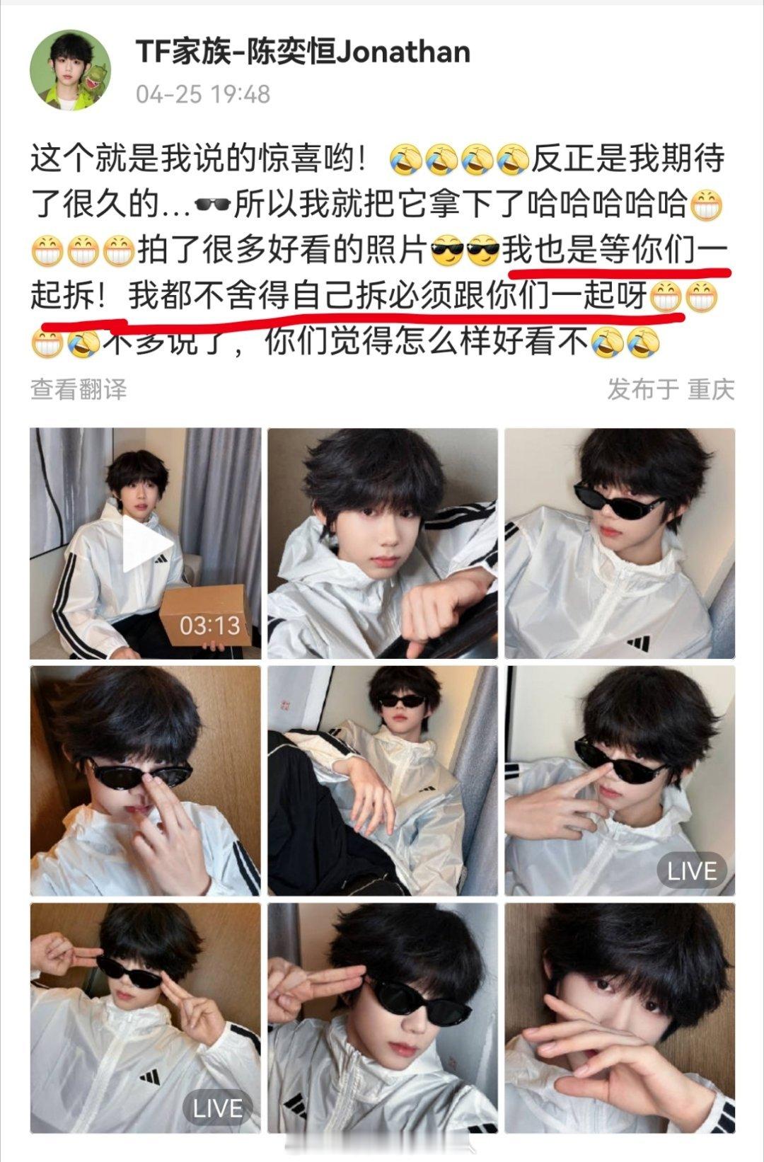 是把粉丝放心上的陈奕恒啊,“我也是等你们一起拆,我都不舍得自己拆必须跟你们一起呀”,看到喜欢的东西第一时间想到的也是要和哼毛一起,被喜欢的人放心上的感觉好幸福吧