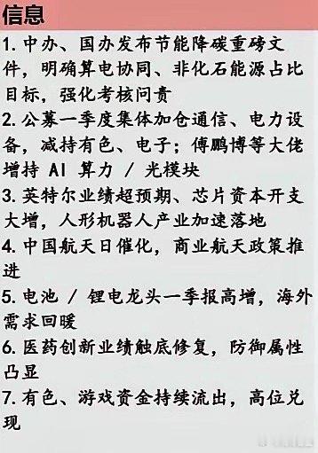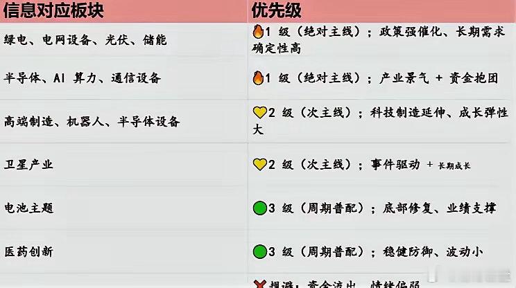 每日信息🔥 1 级 绝对主线核心赛道:AI算力、半导体材料、软件服务、电网设备、绿色电力信息强度:政策顶层文件落地+产业景气共振,多重强催化加持资金共识:机构、大佬集中抱团加仓,主力资金持续净流入🚀 2 级 次主线核心赛道:人形机器人、高端制造、商业卫星、军工装备信息强度:产业落地提速+事件性催化,利好持续发酵资金共识:跟风资金分批布局,分歧适中,为AI延伸配套赛道📊 3 级 周期普配主线核心赛道:电池新能源、光伏、医药创新、均衡混合、有色资源信息强度:温和利好、业绩修复为主,无爆发性强刺激资金共识:稳健资金底仓配置,以防守对冲、均衡布局为主