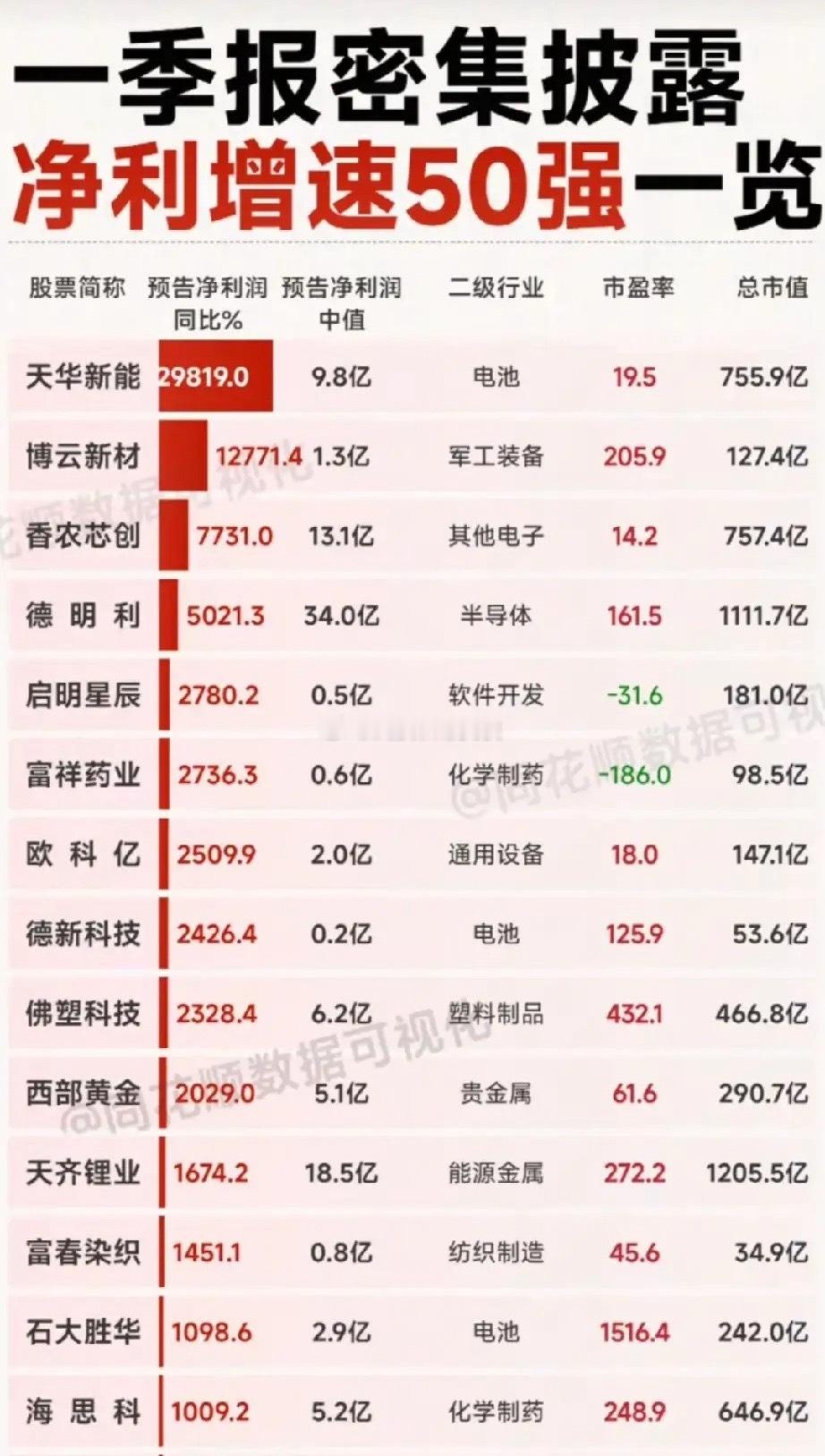 一季报净利狂飙榜:近300倍增速领跑,多赛道企业业绩大爆发!本次梳理的一季报净利增速榜覆盖电池、半导体、通用设备等多赛道,头部企业增速近300倍,锂电、半导体表现突出,估值分化明显,部分标的低估值匹配高增速,也有企业因低基数实现高增。个股梳理分析1. 天华新能:电池赛道,预告净利中值9.8亿,同比增速近300倍,市盈率19.5,低估值匹配超高增速,锂电核心标的。2. 博云新材:军工装备赛道,预告净利中值1.3亿,同比增速超127倍,市盈率205.9,增速亮眼但估值偏高。3. 香农芯创:其他电子赛道,预告净利中值13.1亿,同比增速超77倍,市盈率14.2,低估值高增速,电子分销业务强劲。4. 德明利:半导体赛道,预告净利中值34.0亿,同比增速超50倍,市盈率161.5,存储芯片带动业绩高增,估值偏高。5. 启明星辰:软件开发赛道,预告净利中值0.5亿,同比增速超27倍,市盈率为负,增速源于低基数,尚未盈利修复。6. 富祥药业:化学制药赛道,预告净利中值0.6亿,同比增速超27倍,市盈率为负,原料药业务修复,仍处亏损状态。7. 欧科亿:通用设备赛道,预告净利中值2.0亿,同比增速超25倍,市盈率18.0,数控刀具业务稳定,低估值匹配高增速。8. 德新科技:电池赛道,预告净利中值0.2亿,同比增速超24倍,市盈率125.9,锂电设备带动业绩高增,市值规模偏小。9. 佛塑科技:塑料制品赛道,预告净利中值6.2亿,同比增速超23倍,市盈率432.1,新能源材料增长显著,估值处于高位。10. 西部黄金:贵金属赛道,预告净利中值5.1亿,同比增速超20倍,市盈率61.6,受益金价上行,业绩与估值匹配度尚可。11. 天齐锂业:能源金属赛道,预告净利中值18.5亿,同比增速超16倍,市盈率272.2,锂矿龙头业绩修复,高增速伴随高估值。12. 富春染织:纺织制造赛道,预告净利中值0.8亿,同比增速超14倍,市盈率45.6,色纱业务表现良好,小市值标的增速亮眼。13. 石大胜华:电池赛道,预告净利中值2.9亿,同比增速超10倍,市盈率1516.4,锂电溶剂业务增长可观,市盈率极高。14. 海思科:化学制药赛道,预告净利中值5.2亿,同比增速超10倍,市盈率248.9,创新药业务带动业绩高增,估值偏高。15. 万邦德:中药赛道,预告净利中值1.7亿,同比增速近10倍,市盈率为负,中药业务业绩改善,尚未实现盈利修复。16. 龙蟠科技:电池赛道,预告净利中值2.3亿,同比增速近10倍,市盈率为负,锂电材料业绩修复,仍处亏损状态。17. 恒星科技:通用设备赛道,预告净利中值0.6亿,同比增速近9倍,市盈率351.9,金属制品业务增长显著,高增速伴高估值。18. 盛达资源:工业金属赛道,预告净利中值0.8亿,同比增速超8倍,市盈率49.5,有色金属业务良好,估值相对合理。19. 博腾股份:医疗服务赛道,预告净利中值0.3亿,同比增速超7倍,市盈率104.5,CDMO业务业绩修复,增速可观估值偏高。20. 强一股份:半导体赛道,预告净利中值1.1亿,同比增速超7倍,市盈率132.3,半导体设备带动业绩高增,估值处于高位。21. 赣锋锂业:能源金属赛道,预告净利中值18.5亿,同比增速超6倍,市盈率110.6,锂矿龙头业绩修复,增速估值匹配尚可。22. 新锐股份:通用设备赛道,预告净利中值3.0亿,同比增速超5倍,市盈率82.1,硬质合金业务稳定,估值处于合理区间。23. 联讯仪器:通用设备赛道,预告净利中值1.2亿,同比增速超5倍,市盈率486.9,测试仪器业务增长显著,估值极高。24. 宁波富邦:电网设备赛道,预告净利中值0.3亿,同比增速近5倍,市盈率39.2,铝加工业务良好,小市值低估值增速亮眼。25. 华锐精密:通用设备赛道,预告净利中值1.7亿,同比增速近5倍,市盈率17.0,数控刀具业务强劲,低估值匹配高增速。26. 金山办公:软件开发赛道,预告净利中值21.6亿,同比增速超4倍,市盈率13.2,办公软件龙头,低估值高增速,基本面扎实。27. 东岳硅材:化学制品赛道,预告净利中值1.9亿,同比增速超4倍,市盈率23.2,有机硅受益行业回暖,低估值匹配高增速。28. 远大控股:贸易赛道,预告净利中值0.6亿,同比增速超3倍,市盈率为负,大宗商品贸易增长,增速源于低基数效应。总结整体来看,锂电、半导体、通用设备三大赛道表现突出,多数标的受益行业回暖与低基数实现业绩爆发。估值分化明显,部分标的低估值高增速,也有标的估值偏高或仍处亏损,需关注业绩持续性。