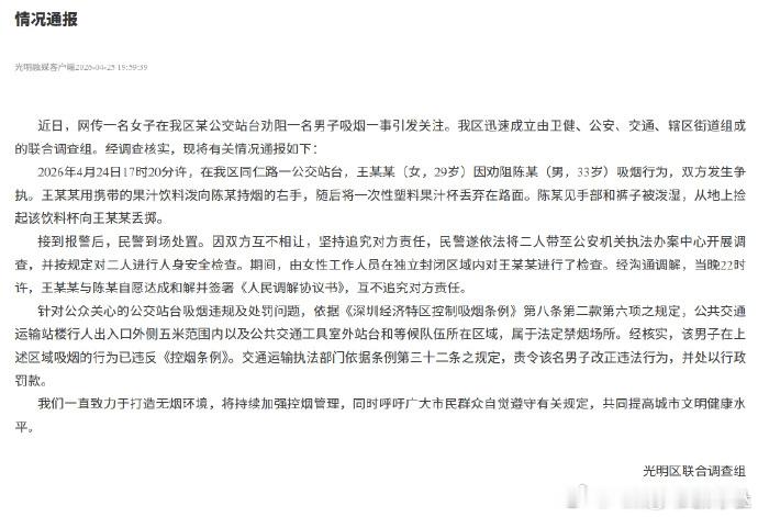 深圳裸检官方通报女子劝阻男子吸烟引争执