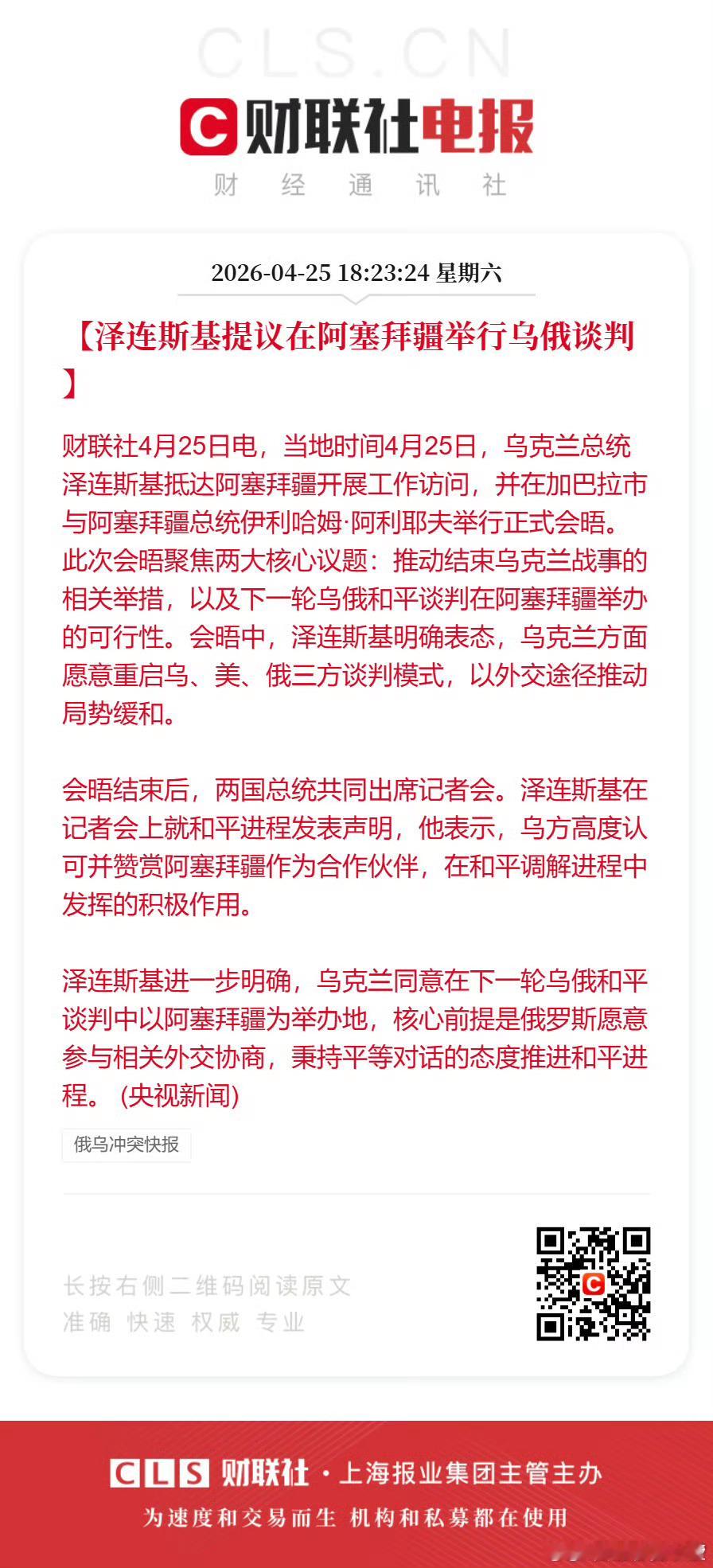 泽连斯基提议在阿塞拜疆举行乌俄谈判。