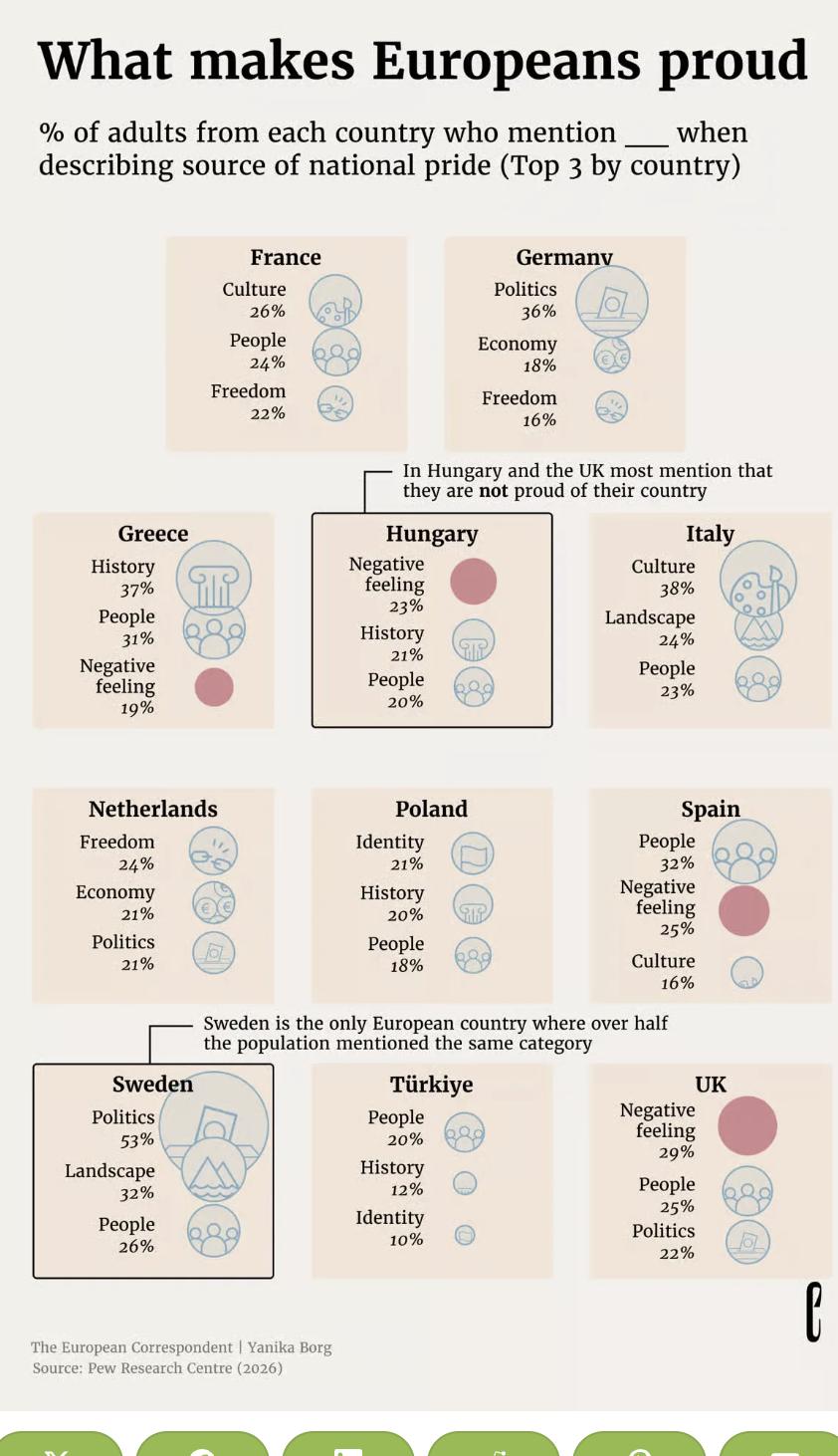 外媒:欧洲人最引以为傲的是什么? 根据皮尤研究中心数据,文化、人民与历史是欧洲各国国家自豪感的三大主要来源,但不同国家差异显著。 瑞典最为突出,53%的受访者以本国政治制度为傲,是所有国家单项数据中最高的;德国以政治为首要自豪来源(36%),其次是经济(18%)和自由(16%)。意大利人最自豪的是文化(38%),希腊人则首推历史(37%)。法国和西班牙均以"人民"为重要来源,占比分别为24%和32%。荷兰人最看重自由(24%),波兰人则以国家认同感(21%)居首。 值得关注的是,部分国家出现较高比例的"负面情绪"——即受访者对本国感到失望或不满:英国以29%高居榜首,甚至超过任何一项积极来源;西班牙负面情绪占25%,位列第二;匈牙利为23%。研究指出,这与民众对执政党的认同度密切相关,政治分裂加剧了国家认同的碎片化,英国尤为明显。 南欧国家更倾向于从历史与文化中寻找自豪感,北欧则对政治制度更具信心,而部分西欧国家则正面临国家认同感的深层危机。