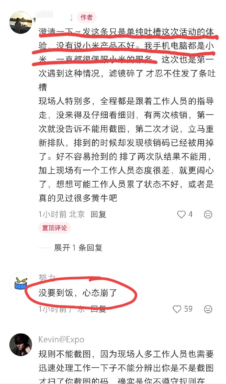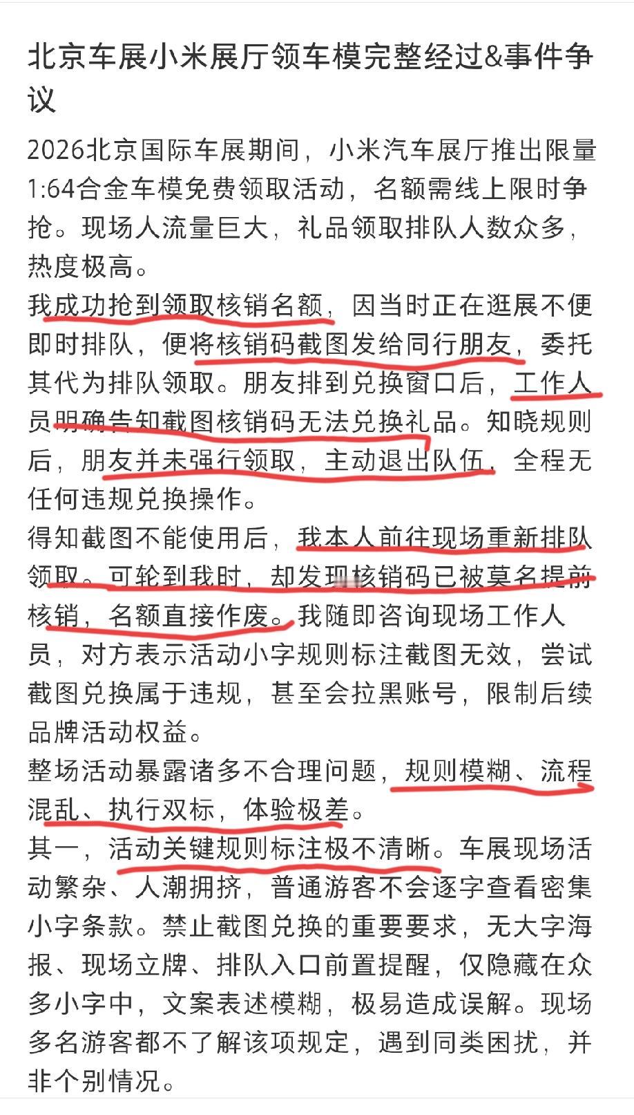 北京,网友发文吐槽:小米汽车北京车展免费赠送车模活动,领了一肚子气出来…… 大概经过就是:这位网友一开始叫朋友拿核销码截图去拿车模,被告知截图无法兑换礼品,他朋友没领车模就走了。之后他又排队去领,却发现核销码已被提前核销了,名额直接被运作废了。就此,这位网友称小米汽车的这个免费赠送车模活动存在很多不合理的地方…… 这位网友还在评论区反复解释:他发这条没有说小米产品不好,单纯吐槽这次活动自己的亲身体验。 评论区网友也是就此事做出了精彩点评:没要到饭,心态直接崩了!所以说,小米汽车这种免费赠送车模的活动到底能引来多少真实的消费者呢?真的不好说! 大家怎么看?
