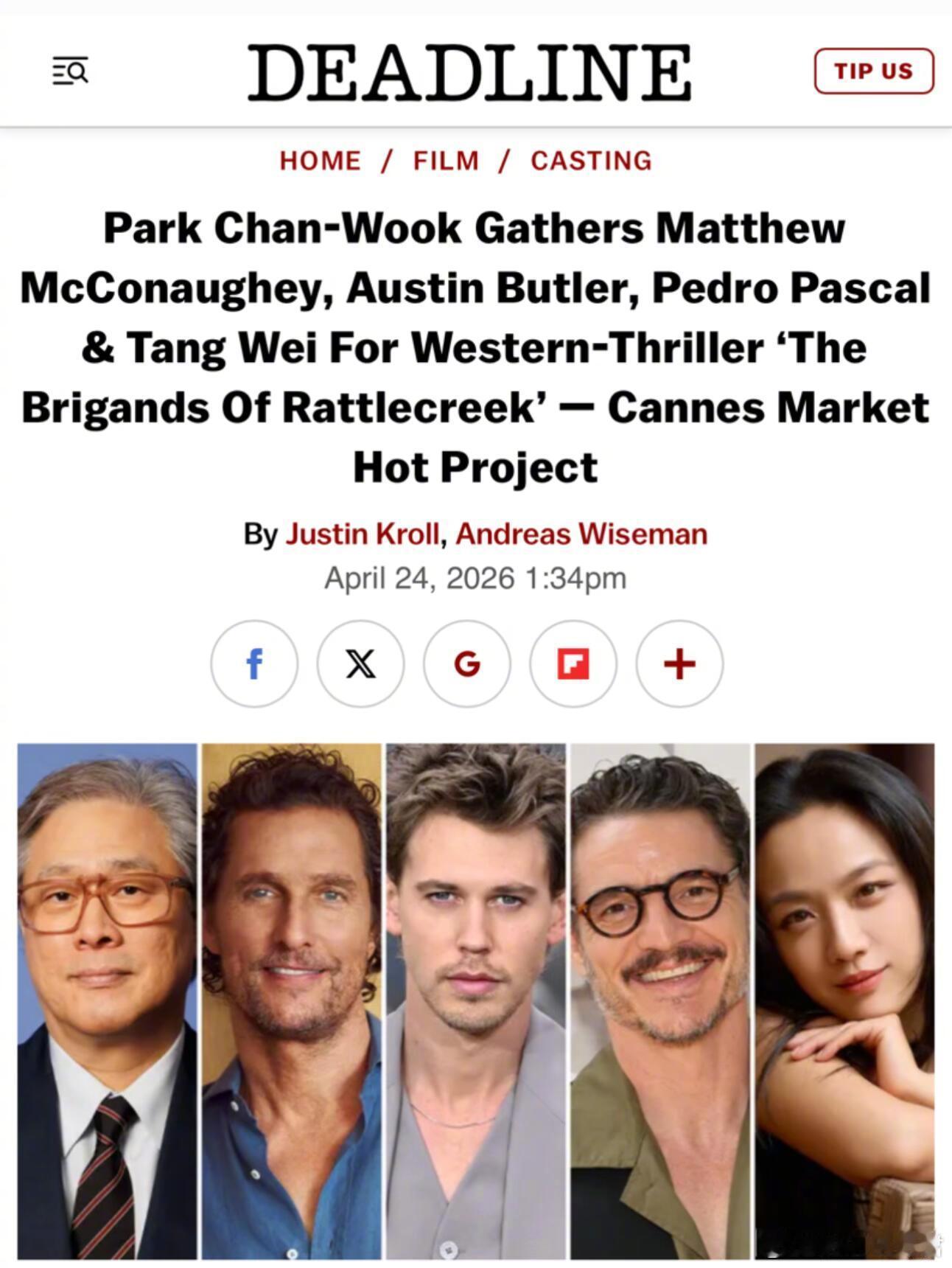 deadline重磅消息,朴赞郁下一部新片将为英语片,由佩德罗·帕斯卡、马修·麦克康纳、奥斯汀·巴特勒以及汤唯主演。影片改编自《战斧骨》导演早年写作的黑剧本《拉特伯格强盗 The Brigands of Rattleborge》,各大制片厂运作此片超过20年,报道指拍摄成本可能在6000万美刀左右。朴赞郁曾在2022年透露过自己正在筹备该片的剧本(他当时说了三部作品筹备中,一部已被拍成去年的《无可奈何》)。