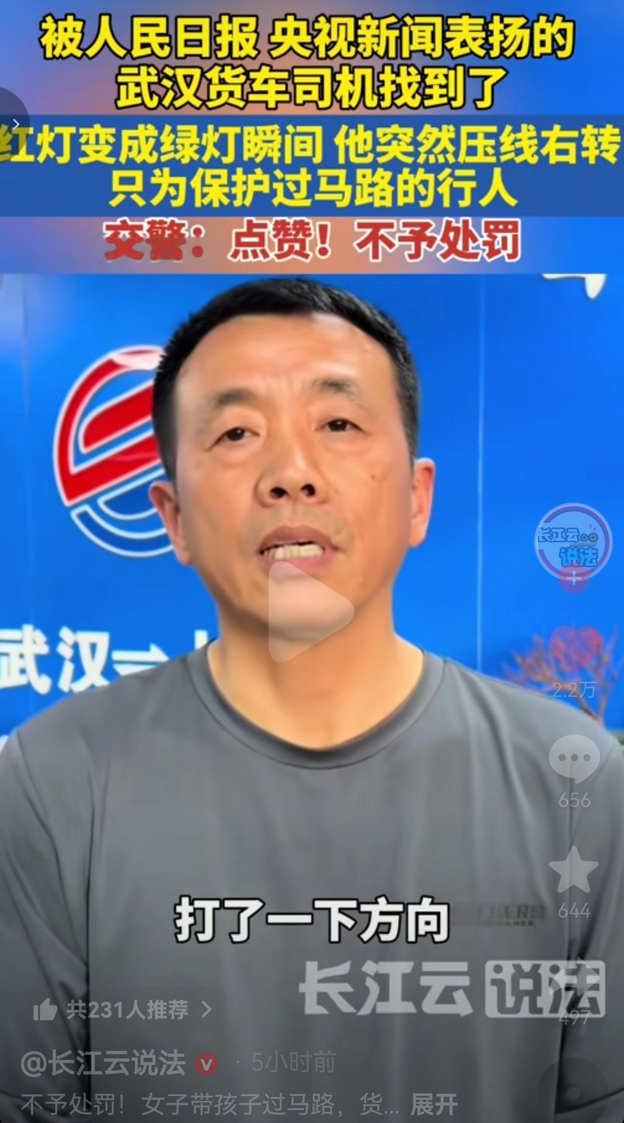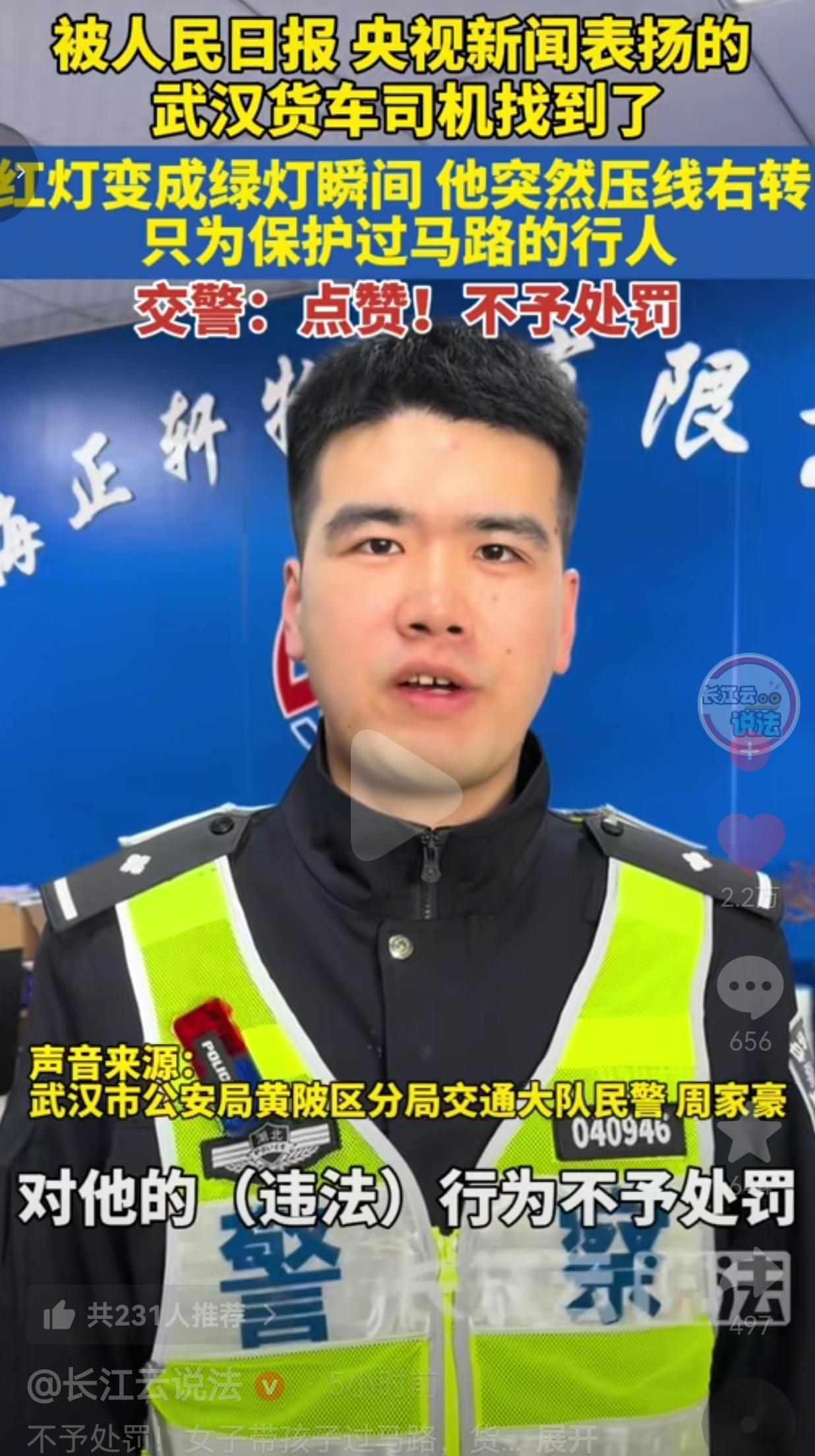 红灯变绿瞬间压线右转,这位货车司机的操作,看完我直接破防 说真的,刷到这段视频,我一下子就看哭了。 说白了,这简简单单一次压线右转,根本不是违章,是司机甘愿自己担风险,硬生生护住了两个普通人的安全。 近日,武汉一红绿灯路口,货车师傅耿良斌,正在老老实实停在路口等红灯。 眼看红灯就剩两三秒,马上就要变绿灯。他随便瞟了一眼斑马线,刚好看到一位妈妈,牵着小孩子过马路,才走到半路。 绿灯一亮,后面排队的车子早就等不及了,一个个蠢蠢欲动,下一秒铁定一脚油门往前冲。 就在这要命的一瞬间,耿师傅来不及多想,完全顾不上扣分罚款。 猛地打方向盘,直接压线右转,把大货车横在路口,稳稳挡住后面所有准备起步的车流。 说实话,这就是本能反应。 他事后也说了,当时没想别的,就怕后车冲太快,撞到过马路的母子俩。自己违规事小,伤到路人那才是真的麻烦。 就这么一个下意识的举动,真的硬生生把两个人从危险边缘拉了回来。 好在交警查看完整监控之后,全程都看在眼里。 心里跟明镜似的,知道司机是好心救人,当场就明确表态,这次特殊压线,不予处罚。 就连央视、官媒都纷纷转发点赞,都说,这才是最暖心、最让人感动的一次善意违章。 网友看到后评论说:干出租十年,太懂这种路况了!货车压线意味着啥,扣分罚款全自己扛,人家一点不犹豫,这人心是真善。 也有的网友说:越看越后怕,那对母子啥也不知道,根本没察觉身后有多危险,真的多亏这位好心司机。 还有的网友说:换做是我,我未必有这个勇气。谁愿意平白无故给自己找麻烦,也就心底善良的人才会这么做。 更有网友表示:开车久了才明白,守规矩容易,关键时刻愿意为陌生人让步、挡险,才最难能可贵。 说实话,看完整件事,心里感慨万千。 这件事明明跟自己一点关系都没有,完全可以绿灯正常开走,啥事没有。 可人家就是不忍心,看不得路人陷入危险。 现在开车上路,太多人只顾自己赶时间。 灯一变绿,立马抢行、加塞、抢斑马线,根本不管行人安不安全。 对比下来,耿师傅这份体谅和善良,真的太难得了。 最让人舒服的一点就是,交警没有死搬硬套规矩。 没有一味盯着违章处罚,而是看清背后的善意,懂得变通,给好人撑腰。 说实话,这样的处理方式,才最温暖人心。 其实,善良这东西,从来都不是非要做什么惊天动地的大事。 很多时候,也就是在路口多停一秒,遇事多让一步,关键时刻愿意多承担一点。 不起眼的小举动,往往最能温暖人心。 很多善意都是默默无声的,不求夸奖,不求回报。 只是单纯觉得,该帮就帮,该挡就挡。 最后,我想说的是:规矩是死的,但人心是活的。心存善意的人,走到哪里,都会自带温度。 对此,你怎么看? 来源:长江云说法