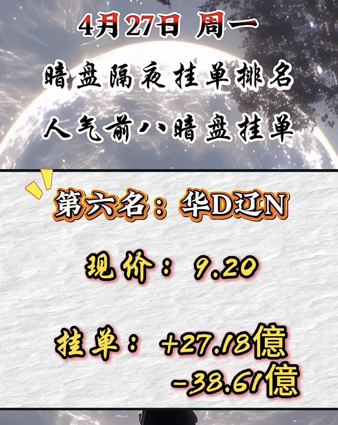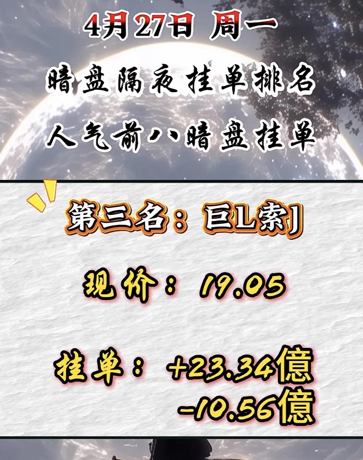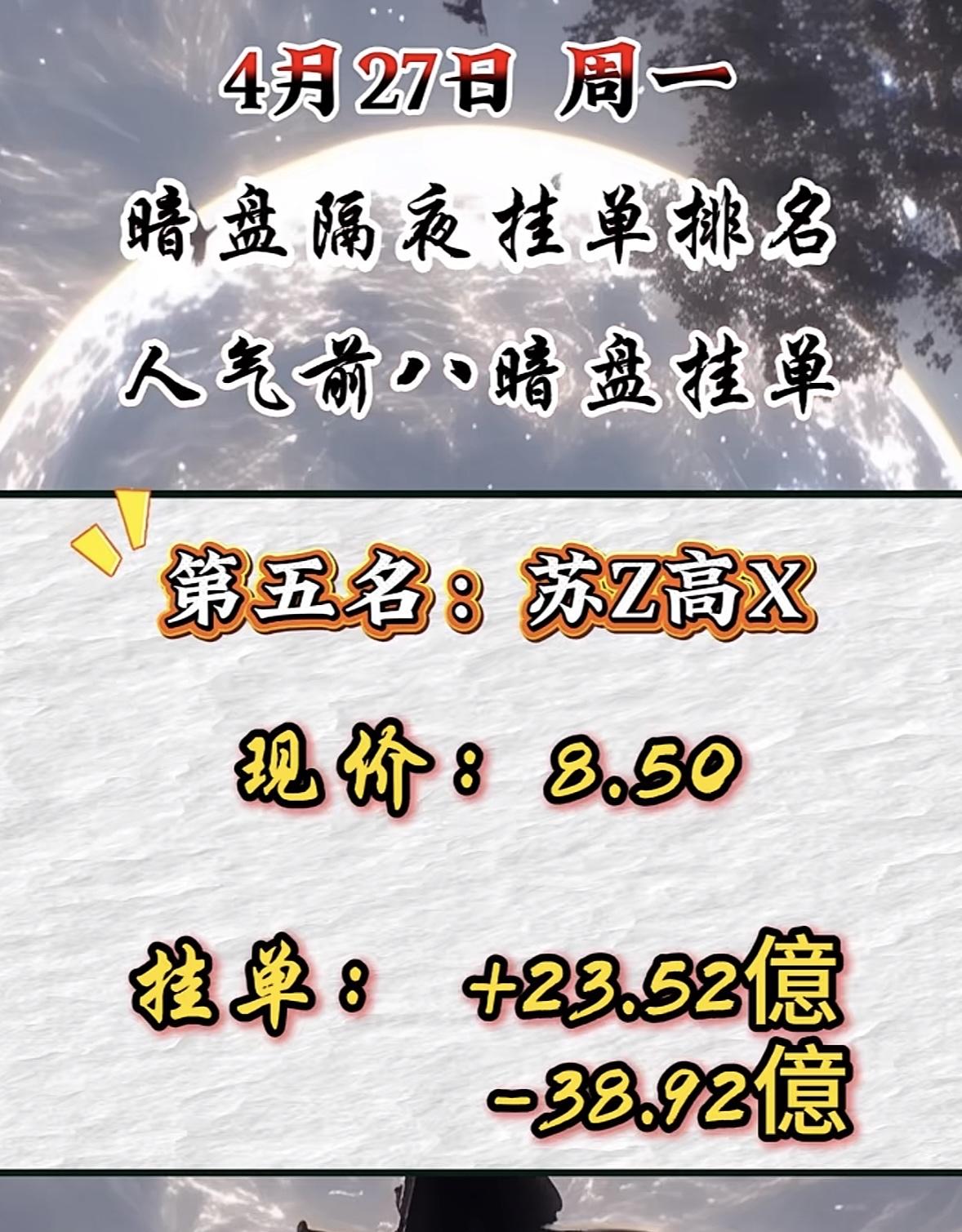 4月27日周一暗盘隔夜挂单排行榜揭晓 4月27日周一人气前八暗盘挂单排行揭晓啦!就说中文在线,当日龙虎榜数据很有看头。它直接跌停,全天换手率26.44%,成交额37.67亿元。机构净买入1458.27万元,可深股通净卖出1.97亿元,营业部席位也合计净卖出6773.03万元。上榜的前五大买卖营业部合计成交9.18亿元,净卖出2.50亿元。 再看看节前一周行情推演,下周一指数或小幅高开试探4100点压力,能源、化工有望延续强势。之后几天,市场也是变化不断,科技线、业绩线等都有不同表现。这市场啊,真是让人捉摸不透又忍不住关注!