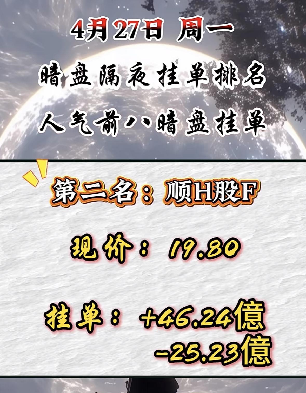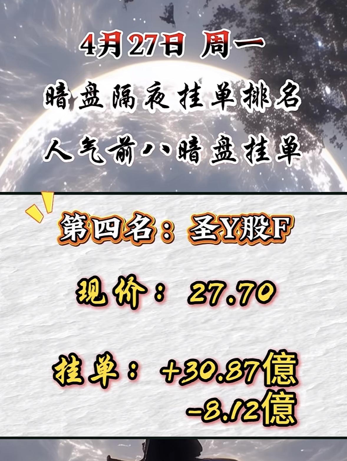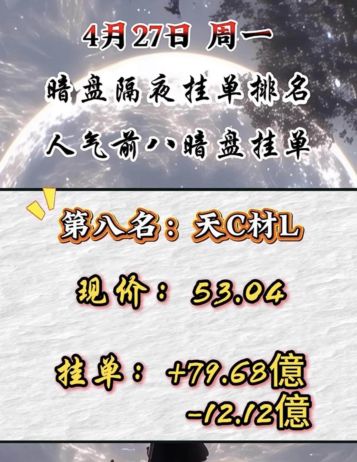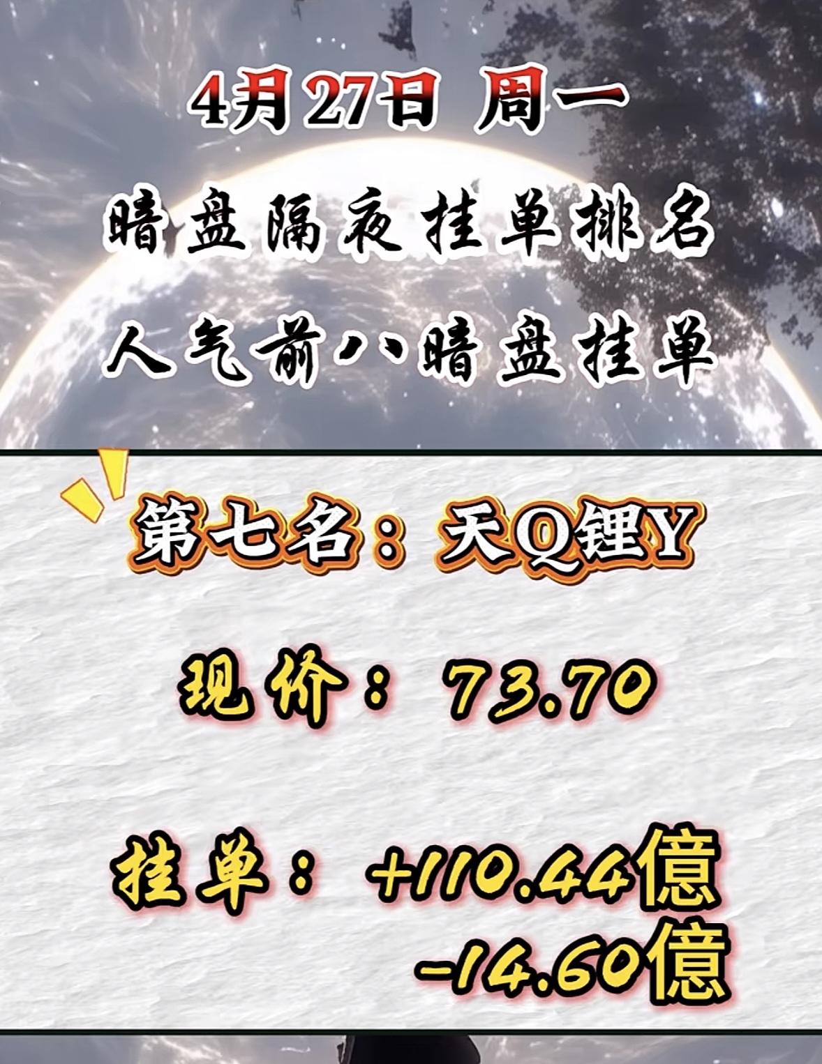 4月27日周一暗盘隔夜挂单排行榜揭晓 4月27日周一人气前八暗盘挂单排行揭晓啦!就说中文在线,当日龙虎榜数据很有看头。它直接跌停,全天换手率26.44%,成交额37.67亿元。机构净买入1458.27万元,可深股通净卖出1.97亿元,营业部席位也合计净卖出6773.03万元。上榜的前五大买卖营业部合计成交9.18亿元,净卖出2.50亿元。 再看看节前一周行情推演,下周一指数或小幅高开试探4100点压力,能源、化工有望延续强势。之后几天,市场也是变化不断,科技线、业绩线等都有不同表现。这市场啊,真是让人捉摸不透又忍不住关注!