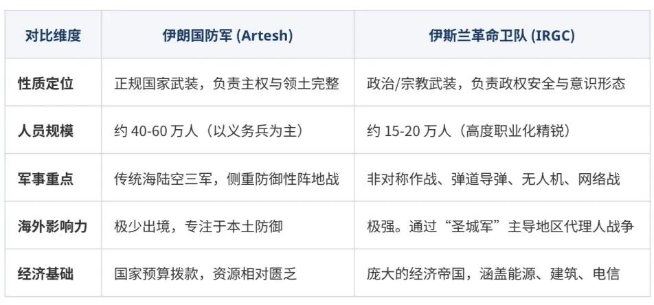 是的,伊朗有着奇葩的“双轨制”的武装力量: 伊朗伊斯兰共和国军队(Artesh,简称国防军)与伊斯兰革命卫队(IRGC)同时存在,但二者在实力、资源和政治声望上存在巨大鸿沟。 国防军: 继承了巴列维时期的底子,拥有约40到60万人的传统陆海空三军,以义务兵为主。由于长期受制裁,其装备(如 F-14 战机、M60 坦克)普遍面临老化问题; 革命卫队: 拥有约15到20万人的高度职业化军队,侧重政权安全与意识形态,重点发展“非对称作战”。伊朗最令西方忌惮的弹道导弹项目和长程无人机集群几乎全部掌握在 IRGC 手中。此外,它还控制着民兵组织“巴斯基”(Basij), 我们译作“动员穷人组织”,在动员能力上远超国防军。 在近年的地区冲突中,似乎听不到国防军的声音,它的存在感极弱,因为国防军在政治、经济及军事装备各方面都无法和庞大的革命卫队帝国相提并论。 自 1979 年革命以来,德黑兰高层对国防军始终持有一定程度的戒备,担心其受到西方思想影响或发动政变。相比之下,革命卫队是“革命的亲儿子”,由教士阶层亲手组建,其政治忠诚度被认为绝对可靠。因此,最重要的战略决策和资金拨付都会优先倾斜给 革命卫队。它不仅是军队,还是一个巨大的经济实体,控制着伊朗多达三分之一的经济活动。这种“以军养军”的能力使其在政治博弈中拥有巨大的发言权。而国防军主要依靠政府拨款,缺乏发声的物质基础。 所以革命卫队的战士都飞扬跋扈,而国防军小兵们就低眉顺目。 一国有两支武装力量,很奇怪吗? 对某些特定政权,这其实是很合逻辑的安排,就如纳粹德国时期的国防军与党卫队并存。但德国的国防军以其职业素养为自己赢得了声誉。