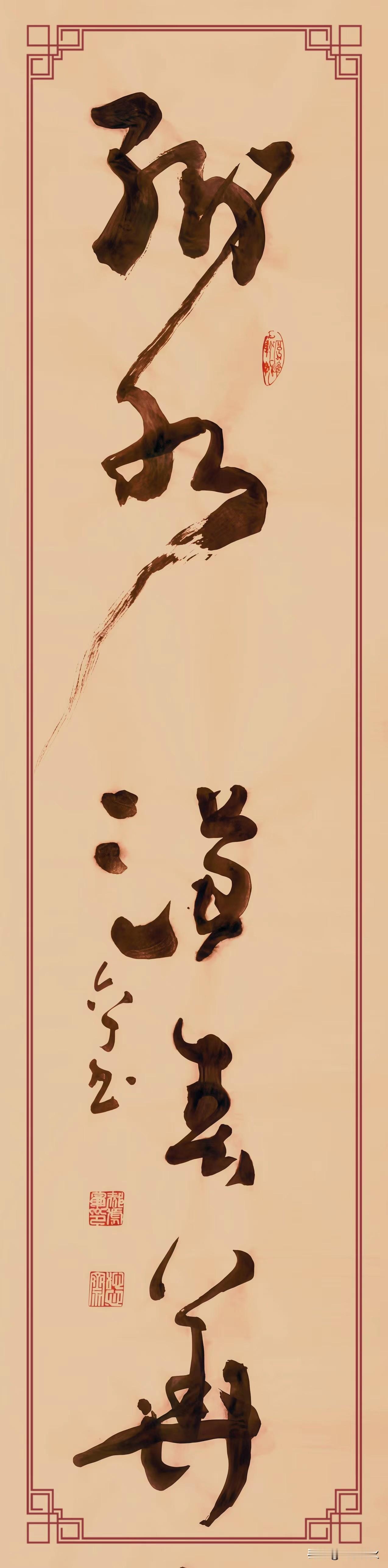 綠水溢春華》笔势奔放,墨色苍润,“青山披锦绣”与“绿水溢春华”对仗工整,意韵天成。线条或圆转如流,或顿挫有力,枯湿浓淡间尽显虚实相生之妙。章法上字势错落,呼应顾盼,一气呵成。既具草书飞动洒脱之姿,又暗合山水春光之景,形意交融,意趣盎然。