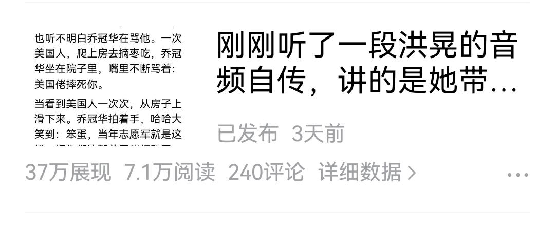 7.1万的阅读量,只有6块多钱。 咱也不知道这是咋回事。 是随机凭心情给啊,还是大数据算法就这么算的? 反正这要是搁以前(起码是2025年上半年以前),这个阅读量的收入应该是在40多块钱左右。 我从不晒收入,没那习惯,也没那必要,写头条是爱好,并不是为了挣钱。 我开始来头条的目的也就是玩,并不知道还有钱可赚。 直到2022年,我才知道在这里玩还能赚稿费。 但头条以前的稿费给的挺多。 今年开始就不的了。 给的很少,偶尔会给个2元,5元的,再偶尔会给个30元,30元在我这就算最多了,基本顶天了。
