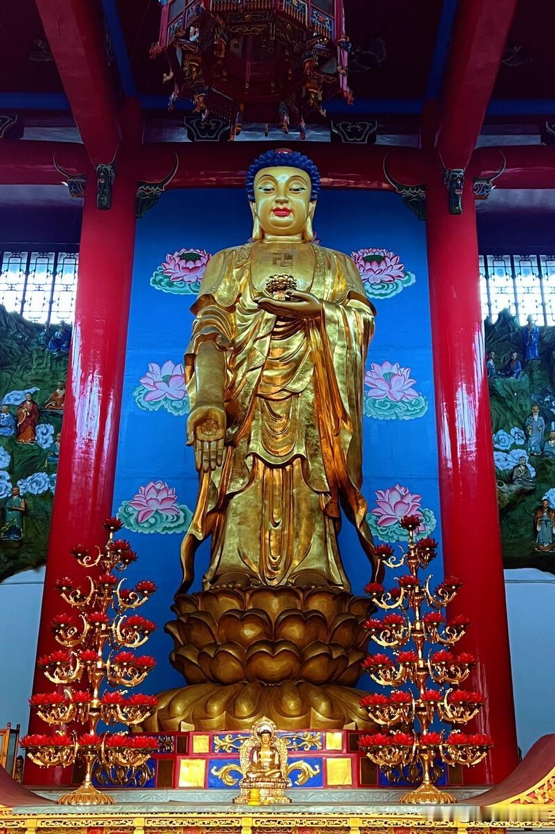 九华山月身宝殿里的这尊接引佛,藏着最温柔的“回家”约定 踏进九华山月身宝殿的弥陀殿,第一眼就被这尊金身阿弥陀佛的温柔击中。 他身姿挺拔立于莲花座上,右手下垂、掌心向外,是“接引印”,像在轻声唤着每个漂泊的灵魂;左手托着莲台,是为众生预备的净土。身后蓝底莲花壁画,衬得整尊像像浸在一片清辉里,眉眼间全是安定。 都说“弥陀愿力,如父忆子”,他不像别的佛那样威严,更像一位在路口等你的长辈,无论你带着多少疲惫与心事,他都笑着接你回家。很多人来九华山,会先在这尊像前静静站一会儿,再往后走。 愿你我都能接住这份温柔的接引,在烟火人间里,也能寻到属于自己的安宁与归途。🙏 佛教圣地 九华山
