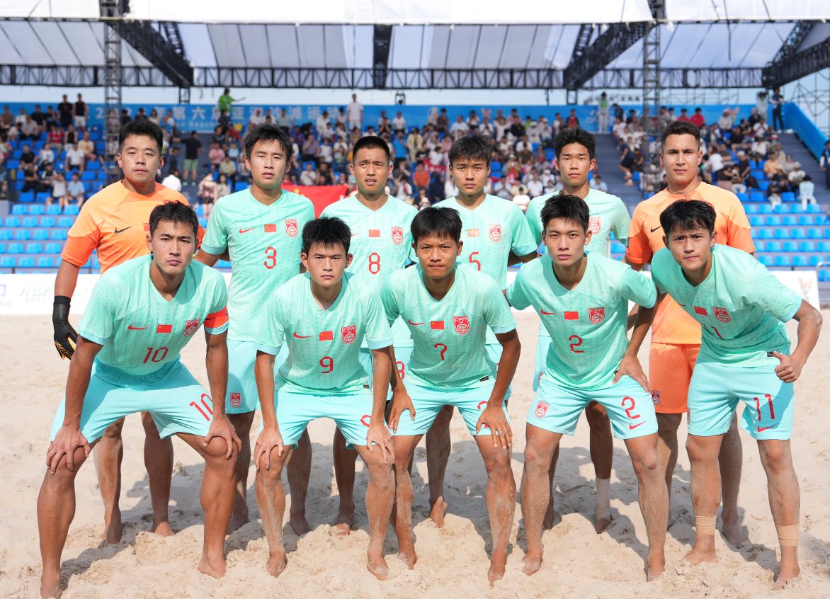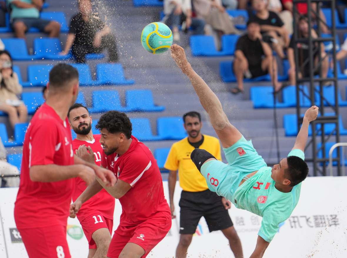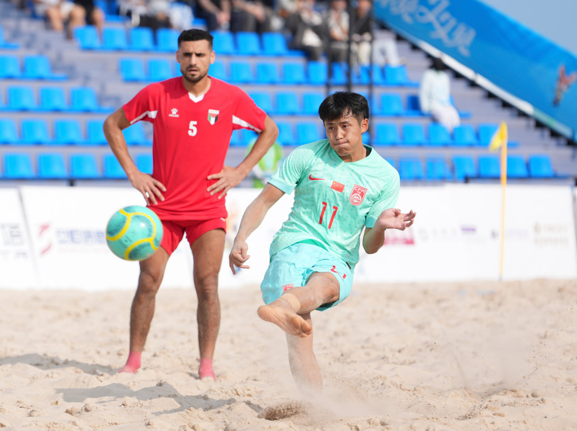 下午16时,阳光灼人,沙滩被晒得滚烫。队员们清一色赤足上阵,脚趾深深抠进细软又硌脚的沙粒,每一次启动、急停、变向,都要对抗沙地的巨大阻力,脚踝与膝盖时刻承受冲击。比赛刚开始,中国的“沙滩小子”利用对方犯规,获得点球,可惜球滑门而出。巴勒斯坦门将哈瓦吉里则利用反击大力射门,球折射后破门,巴勒斯坦先下一城。第二节,巴勒斯坦萨伊尔利用反击再度破门。“没问题的,再来。”教练刘易斯在场边大喊,让球员不要气馁。中国队进攻被侵犯,苟永民虽然点球被扑但随后补射得手,中国队将比分扳为1比2。第二节末段谭坊伦利用头球破门,将比分扳平。第三节,巴勒斯坦阿提亚任意球进球,他们又再度领先。中国队崔志耀左脚一记吊射球门死角得手,令全场再度沸腾。巴勒斯坦队萨伊尔随后又利用反击头球命中,最终中国队以3比4惜败巴勒斯坦,出线前景不容乐观。