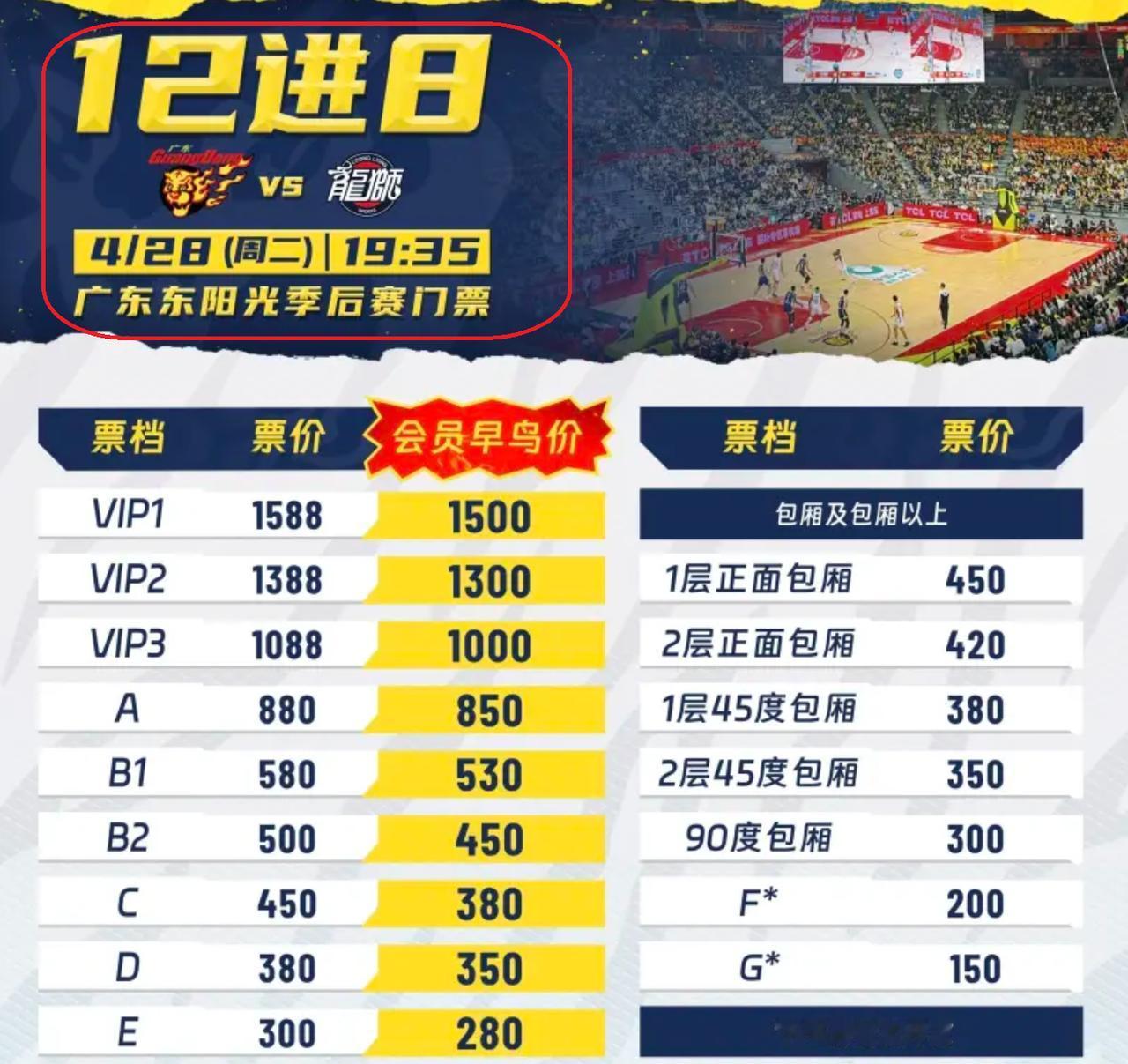广东队季后赛门票价格出炉,分九档,最便宜300元,最高1588元! 本赛季,志在争冠的广东队,常规赛成绩,可以说是十分不理想,以27胜15负的成绩,只排在积分榜第5名。球队本赛季投入这么大,成绩进不了积分榜前四名,显然,这样的结果,对于广东队上下都是不满意。当然了,广东队球迷就更不满意了,有一种恨铁不成钢的感觉。 因为成绩只排在积分榜第五名,因此,广东队季后赛只能从12进8的附加赛开始,有意思的是,广东队首轮的对手,是同城兄弟广州队。更有意思是,广州队正是前广东队中锋徐昕效力的球队,毫无疑问,这个系列赛,也成为了CBA12进8,最有话题的比赛。 广州队球迷知道球队晋级季后赛,并且PK广东队的时候,有不少人就对着徐昕喊,“干-杜锋,干-杜锋……”面对球迷如此喊话, 徐昕也是十分开心,以微笑面对。 毫无疑问, 徐昕对广东队会打出什么样的表现,让很多球迷十分期待。 根据比赛规则,12进8的比赛,采用三局两胜的赛制,1-1-1,成绩靠前的球队,拥有主场优势,也就是说,双方的比赛,先在广东队主场开打。 值得一提的,在比赛来临之际,广东队也是在第一时间公布了门票的价格,从广东队的门票价格来看,一共分为九个档,最便宜的价格为300元,最贵的价格为1588元。 广东队具体票价如下: 第一档,1588元, 第二档,1388元, 第三档,1088元, 第四档,880元, 第五档,580元, 第六档,500元, 第七档,450元, 第八档,380元, 第九档,300元。 考虑到广东队主场可以坐16000名观众,也就是说,广东队一场比赛的门票收入,就快接近1000万的收入,这也难怪有球迷表示,广东队之所以不愿意冲进积分榜前四名,就是为了参加附加赛,可以多赚点门票。 那么,各位看官,您想到广东队主教练观看比赛吗?