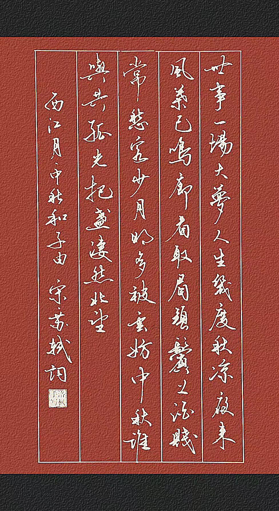 西江月·中秋和子由 【宋・苏轼】 世事一场大梦,人生几度秋凉? 夜来风叶已鸣廊。看取眉头鬓上。 酒贱常愁客少,月明多被云妨。 中秋谁与共孤光。把盏凄然北望。 古诗词苏轼 每天学习一点点 一起练字