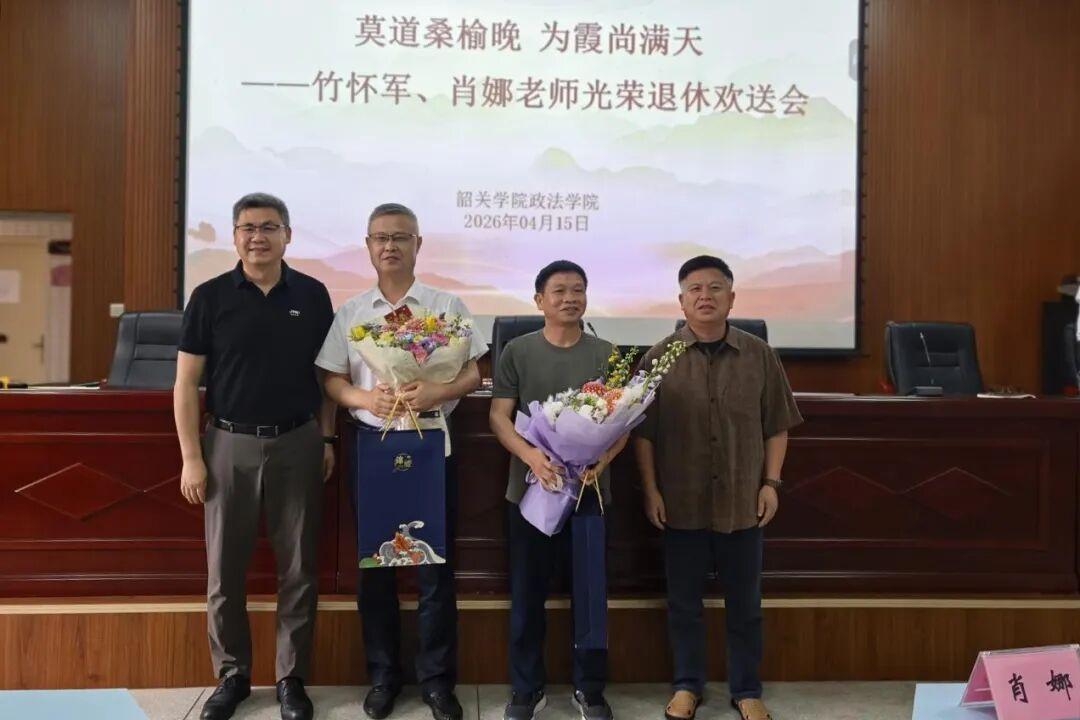 韶关学院政法学院举行竹怀军、肖娜老师荣休欢送会 4月15日举行,院党委书记林家坚讲话,徐素萍、林睦翔、孙旖、马汉仔、贺益民、刘俊松等教师代表依次发言,刘卓、曹银山两位青年教师代表为竹怀军、肖娜老师献上鲜花。