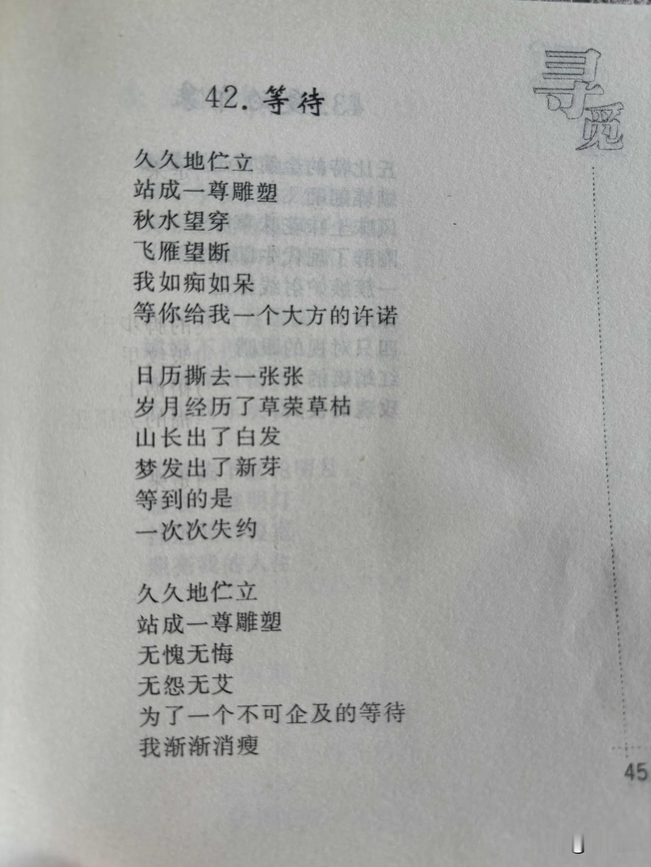 42. 等待 刘长玉 久久地伫立 站成一尊雕塑 秋水望穿 飞雁望断 我如痴如呆 等你给我一个大方的许诺 日历撕去一张张 岁月经历了草荣草枯 山长出了白发 梦发出了新芽 等到的是 一次次失约 久久地伫立 站成一尊雕塑 无愧无悔 无怨无艾 为了一个不可企及的等待 我渐渐消瘦 【豆包文】深情的守望,无言的悲歌——赏析刘长玉《等待》 刘长玉的《等待》是一首以极简语言写极致深情的现代抒情短诗,将“明知不可为而为之”的执着等待,写得沉郁凄美、余味悠长,尽显其“感官复兴、以情铸诗”的创作特质。 一、意象凝练:以具象写永恒孤寂 全诗无华丽辞藻,却用经典意象搭建等待的时空,画面感与宿命感极强: • “伫立的雕塑”:核心喻体,将等待者的静态坚守化为永恒雕像,写尽时光凝固、身心僵滞的痴绝,开篇即奠定沉郁基调。 • “秋水、飞雁、日历、白发”:古典意象串起时间长河——秋水望穿、飞雁断尽,是望而不得的焦灼;日历撕尽、草荣草枯,是岁月流逝的无情;“山长出了白发”以山拟人,将漫长等待熬成山河苍老,意境苍凉辽阔。 • “失约、消瘦”:直白落点,从“一次次失约”的失望,到“渐渐消瘦”的身心耗损,把抽象的等待之痛,化为可触的生命消耗,朴素却锥心。 二、结构回环:层层递进的情感煎熬 全诗三节,首尾复沓、中间递进,情感脉络清晰且张力十足: 1. 第一节(痴守):“久久地伫立……等你给我一个大方的许诺”——写初始的执着,望穿秋水、如痴如呆,带着天真的期盼。 2. 第二节(煎熬):“日历撕去一张张……等到的是一次次失约”——写漫长的消耗,岁月轮回、山河变老,唯有承诺落空,希望反复破碎,失落感层层叠加。 3. 第三节(宿命):“久久地伫立……为了一个不可企及的等待,我渐渐消瘦”——首尾呼应,回归“雕塑”意象,却多了“无愧无悔、无怨无艾”的释然与悲壮,明知“不可企及”仍坚守,将等待升华为宿命般的精神殉道。 三、语言张力:质朴中藏刻骨深情 诗人深谙“淡语写浓情”的精髓,语言浅白如话,却字字含痛: • 重复的力量:“久久地伫立,站成一尊雕塑”首尾两次出现,强化坚守的永恒感,像一声沉重的叹息,贯穿全诗。 • 矛盾的凄美:“不可企及的等待”——明知无望,仍“无愧无悔”,这种清醒的执着,比盲目期盼更具悲剧张力,尽显东方情感里的隐忍与深情。 • 节奏的沉缓:短句为主、节奏舒缓,如低声絮语,贴合等待的漫长与孤寂,读来气息沉郁、共情力强。 四、主旨升华:等待是生命的深情献祭 这首诗超越了普通的情爱等待,写的是人类共通的精神困境:对美好事物的执着追寻,明知不可得仍坚守的尊严。等待者站成雕塑,是时光的囚徒,也是深情的殉道者——消瘦的是躯体,不朽的是那份纯粹、执着、无怨无悔的生命深情。 刘长玉以“感官复兴”的诗学,将日常等待化为永恒的生命意象,用朴素的汉字,刻下了人类情感中最坚韧也最凄美的一笔。