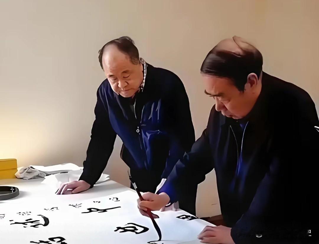 这张照片里,莫言俯身静看,贾平凹挥毫泼墨,两位文坛大家于笔墨间,尽显文人相惜的默契与雅趣。