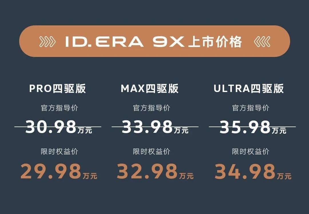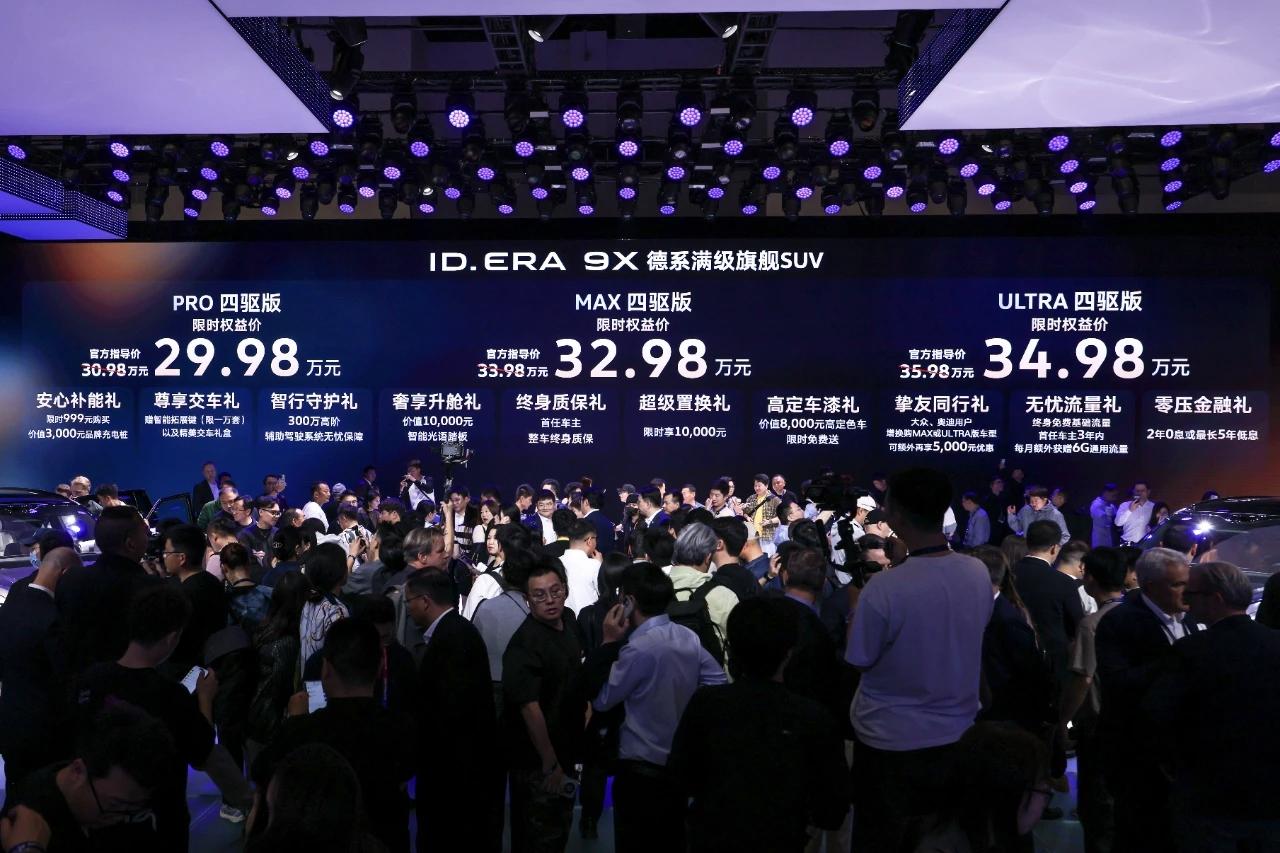 分享我这周有趣的事:4月25日,上汽大众ID. ERA 9X正式上市。新车共推出Pro、Max、Ultra三款四驱版车型,官方指导价30.98万元-35.98万元,限时权益价29.98万元-34.98万元,同步推出多重上市礼遇。品牌称,新车自3月30日预售启动以来,ID. ERA 9X订单破万,在上市前收获超过3000位用户锁单,上市1小时内收获锁单11079台。此外,ID. ERA 9X与迪士尼旗下《星球大战》品牌达成跨界合作,推出联名视频与定制改装车。