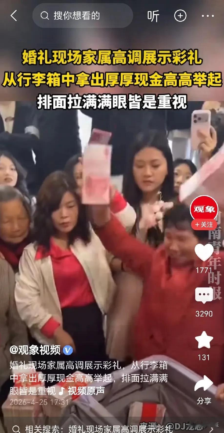 “太有面了”!江西,婚礼现场,家属从行李箱中拿出厚厚的现金,并且当着亲朋好友的面一沓沓高高举起,现场排面拉满满眼都是重视! 视频中,一位身穿大红色衣服的中年女性从行李箱中拿出两沓现金高高举起,她的身旁围满了亲朋好友,靠得近的把头抬得高高的,离得远的直接举起手机录像,现场气氛热烈! 原来,这是一对新人的结婚现场,这位中年女性很可能是新人的妈妈,她面前的行李箱里满满当当全是用红色丝带捆扎好的现金,红色代表喜气,细节之处体现满满! 然而,她每一次将厚厚的现金高高举起,现场亲友都会发出一声声“哇”的惊叹声,后面的人看不到,要么是踮着脚伸着头,要么举着手机录像,这位妈妈满脸的自豪感! 看了这个视频,我也是感慨颇深! 彩礼在我国是一个传统习俗,即使到到了今天这个非常开放的时代,依然是绕不开的话题! 对于彩礼各人各见解,有人赞同有人反对,我还是比较赞同的,毕竟女人是要生孩子的,生孩子对女人来说不光要承受身体上的痛苦,还要担负生养孩子的重任,所以,我认为彩礼在一定程度上也算是对女方的一种补偿吧! 非常羡慕这对新人,男方能拿出这么多的彩礼,一方面说明男方对女方的重视,另一方面也说明男方的实力! 中国一句老话叫“门当户对”,男方能拿出这么多的彩礼,要么女方家庭有实力,要么女方自身有值得男方欣赏的实力! 所谓的男女平等,都是靠实力争取来的! 对于我们普通家庭而言,彩礼还是应该量力而行,既要双方满意,又要符合家庭经济承受能力,您说是吗?