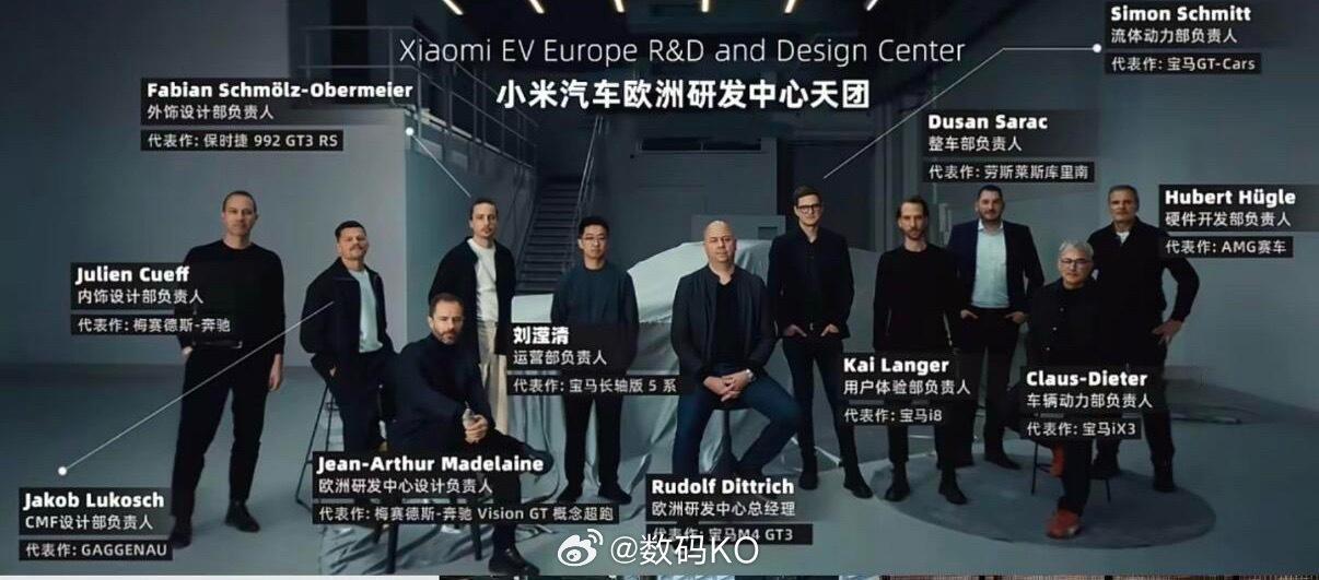 人人嘲讽小米造车太年轻,殊不知只是小米汽车年轻,造小米的团队可不年轻。在北京国际车展上,雷军公布了小米的欧洲研发中心核心人员:总经理Rudolf Dittrich是宝马M部门资深专家,代表作宝马M4 GT3;车辆动力负责人Claus-Dieter Groll,主导过宝马3系、4系、Z4、X5等多款王牌车型。设计端,设计负责人Jean-Arthur Madelaine履历横跨多家豪华品牌;外饰负责人Fabian曾效力兰博基尼、保时捷,精通超跑造型;内饰负责人Julien Crueff出身奔驰,擅长豪华座舱打造;CMF负责人Jakob Lukosch深耕高端材质工艺。