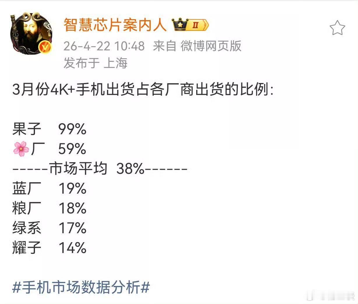 目前,市场的平均水平大概是38%左右。华为,59%;vivo,19%;小米,18%;OPPO,17%;荣耀,14%。