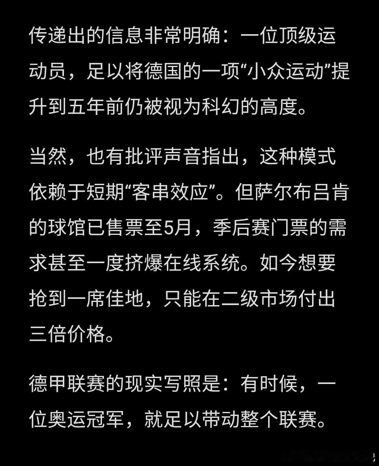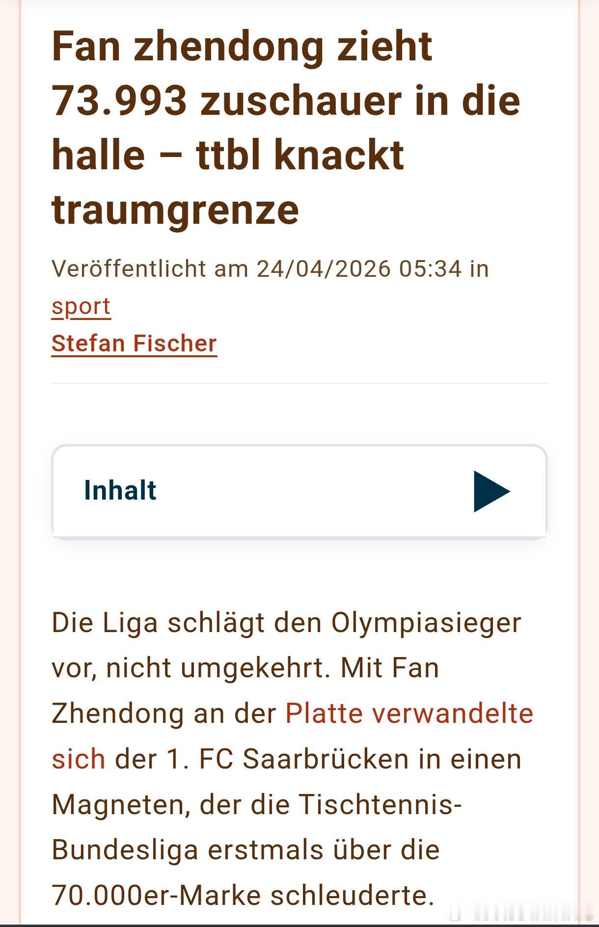 德国媒体盛赞樊振东:樊振东吸引73,993名观众进场--德甲联赛TTBL突破梦幻大关!不是联赛在“蹭”奥运冠军的热度,恰恰相反,是奥运冠军为联赛带来了前所未有的能量。随着樊振东站上球台, 萨尔布吕肯俱乐部瞬间变身为一块“磁铁”,将德国乒乓球甲级联赛的观众总数首次推过了7万大关。 有时候,一位奥运冠军,就足以带动整个联赛。