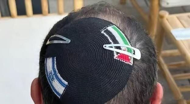 一名自由派犹太人因佩戴印有以色列和巴勒斯坦国旗的犹太小圆帽(Kippah,“基帕”)被以色列警方逮捕。巴勒斯坦国旗被剪掉,小圆帽被归还给主人。