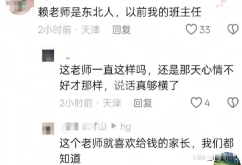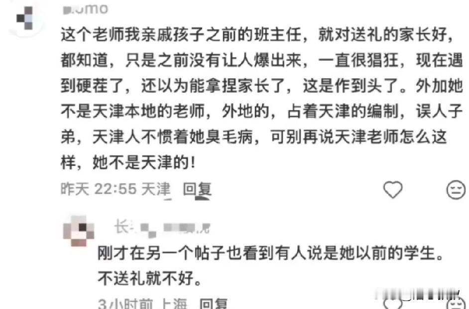 天津的赖老师还真是个名副其实的赖老师,看看以往的家长爆料就知道了,一点也不冤。 家长说:孩子回来说今天在学校发的卷纸发到他那没有了,让您发个电子版。 老师回:嚯,这让老师给发个电子版,一点也不客气,那么大派头呢!我没有电子版…… 听听老师的语气:嚯……老师还反诉家长没礼貌,都说您了,还得怎么算客气呢? 说实话现在城里的学校可以说很多学校里都有有一个赖老师,怼天怼地对家长。我家孩子就遇到过,只是不想和她掰扯就是了,想着孩子还在她那手底下上学,不想让她给孩子小鞋穿,就忍了。
