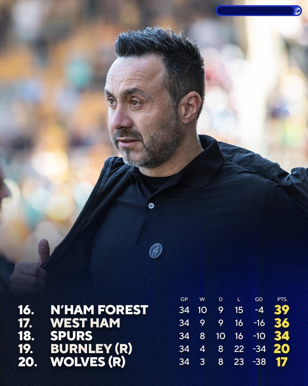 威尔逊92分钟的进球绝杀埃弗顿,这意味着热刺拿到德泽尔比治下的首胜后,依旧身处降级区。热刺球员的斗志稍有起色,但未来的保级大战依旧困难重重,vs狼队的比赛,索兰克和西蒙斯再次受伤。森林和利兹联已经保级无忧,热刺只有期待逆转身前的西汉姆联,才能保级成功。最后一轮热刺vs埃弗顿,西汉姆vs利兹联,可能要到最后一刻才能决定两支伦敦球队的命运。