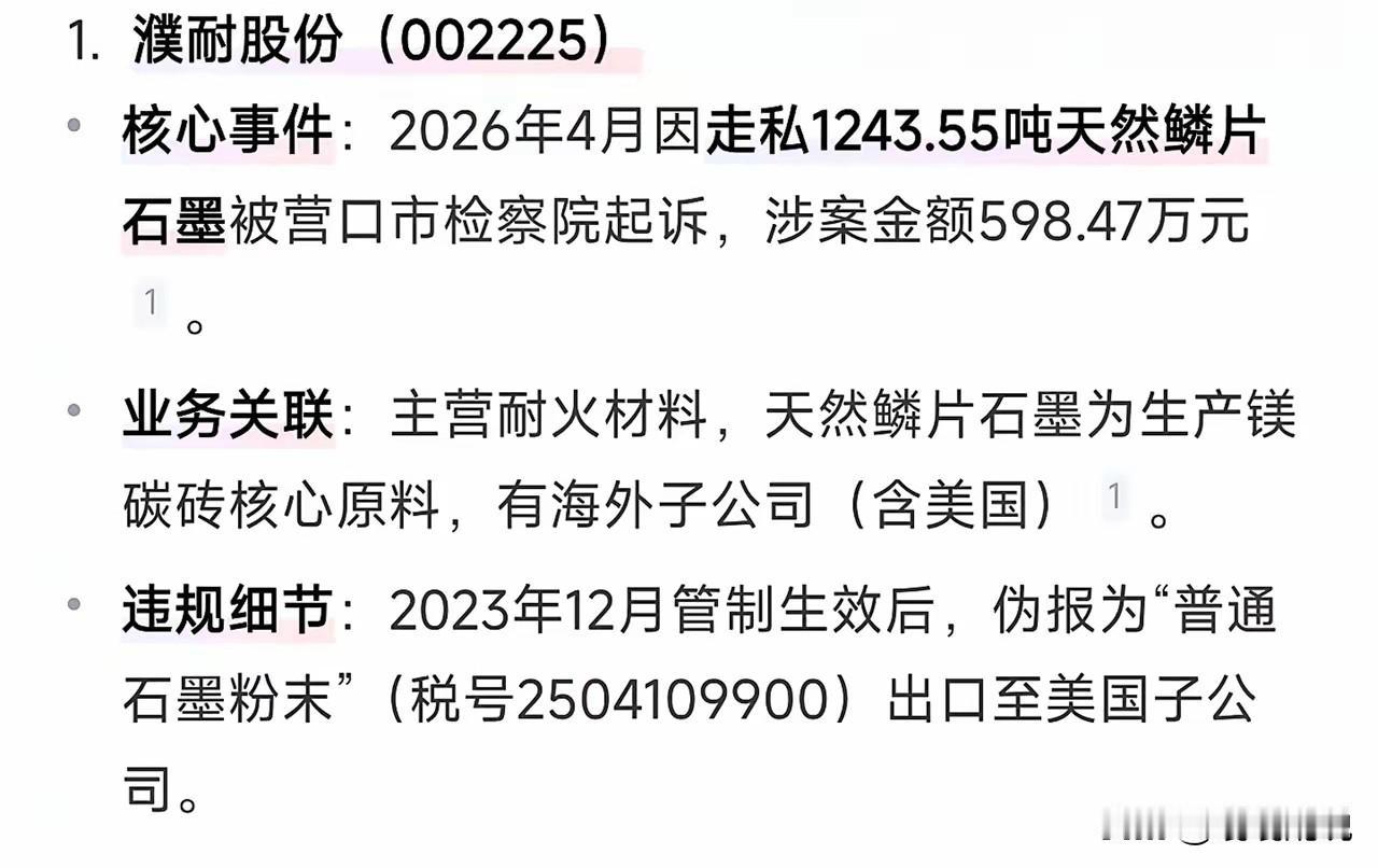 细思极恐!濮耐股份走私案,幕后真的只是4名高管吗? 濮耐股份上千吨战略石墨走私案持续发酵,眼下被起诉的是副总祁长生等4名高管,可这事越琢磨越不对劲,背后真的没有更深层的推手吗? 要知道濮耐股份董事长刘百宽,可不是普通的企业管理者。1990年他公派到美国RSR研究所做研究,1993年回国就出任濮耐厂长兼总工程师,一路把企业做成A股上市公司,是公司实打实的核心掌舵人,对公司的海外业务、核心原料出口流程,不可能毫不知情。 天然鳞片石墨是国家严管的战略物资,出口管制政策官宣后,但凡企业有规范的管理流程,这类违规报关操作根本不可能发生,更别说持续近一年、累计上千吨的规模。这种系统性、长期化的走私行为,绝非几个中层高管能独自拍板、全程隐瞒的。 上市公司的海外业务审批、货物出口管控,都有层层流程,作为公司创始人兼董事长,对如此大额的违规出口毫无察觉,本身就不合常理。眼下把责任全推到基层高管身上,很难让公众信服。 企业掌舵人本该守住合规底线、维护国家利益,可如今出现触碰国家安全红线的大事,绝不能简单让几名高管当“背锅侠”。真相到底如何,必须彻查到底,给市场和公众一个交代。 你觉得这起走私案,背后会不会另有幕后主使?石墨制品出口