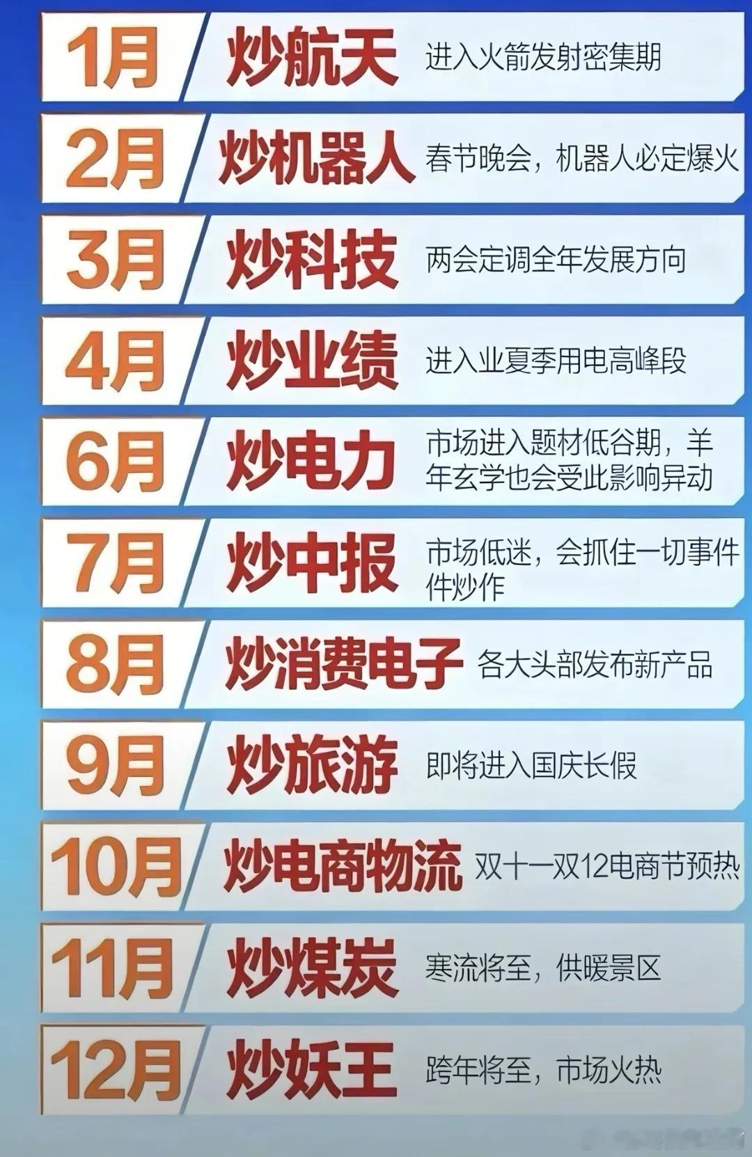 马年到来,炒股规律已经显示出来,像1月份炒商业航天,2月份炒的就是机器人,3月份炒的就是科技,4月份又炒的业绩就年报业绩,还有一季度报业绩。那后面呢?大概率是炒电力啊,中报业绩旅游这些,这些都是个率比较大的。
