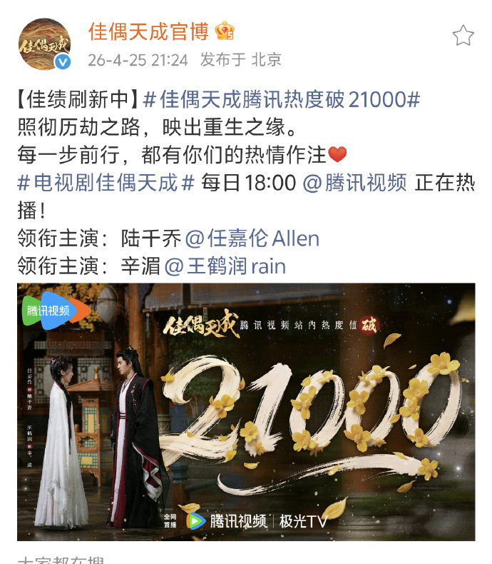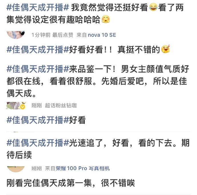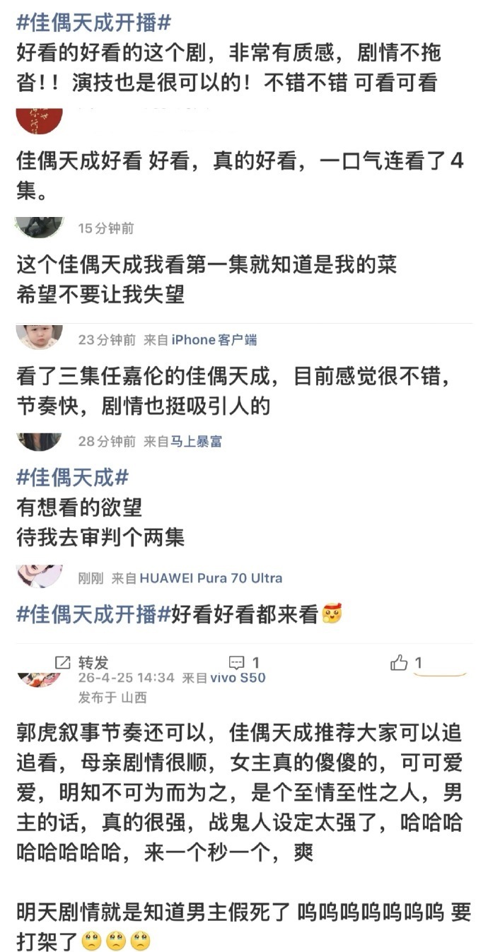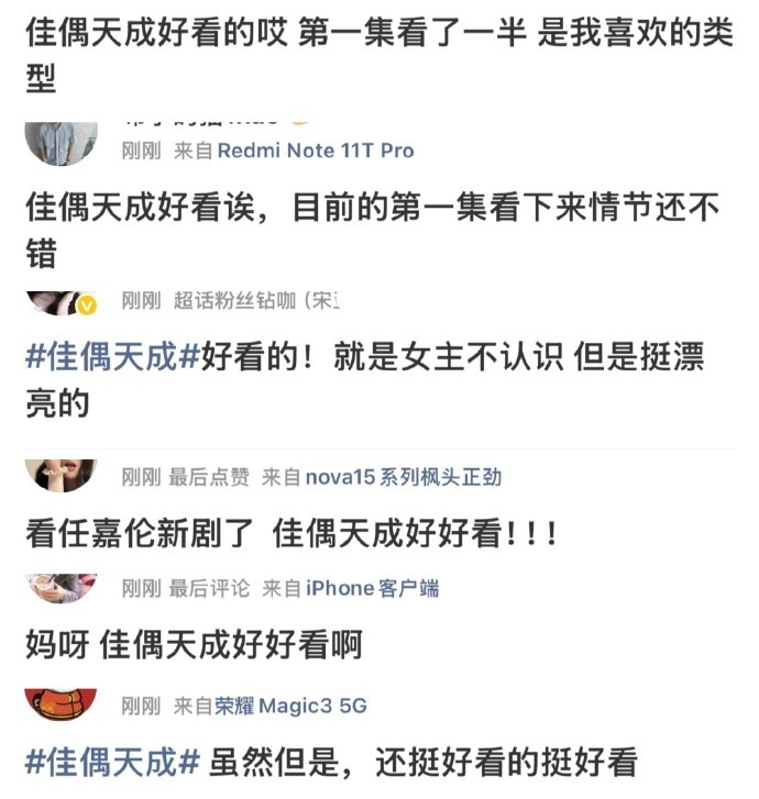 佳偶天成 我的评分:佳偶天成首播观众反响任嘉伦新剧《佳偶天成》开播首日爱奇艺热度破6000,腾讯热度破21000,临时分销并没有参加腾讯招商会,依旧双平台带广!不靠宣传造势,全靠路人盘和剧粉支撑,首播口碑反馈也都很好,全是活人讨论度!!!