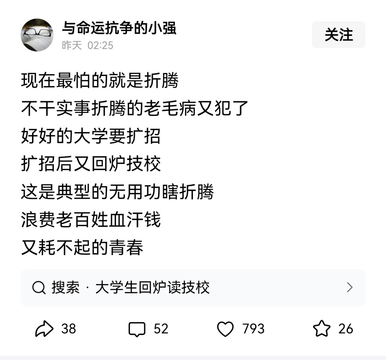 这个因果关系搞错了。不是大学自己要扩招(目前扩招的主要是公办本科,扩招的大学压力也大),而是家长和社会舆论,要求提高优质本科录取率、本科录取率,加上适龄学生增加,不得不扩招。这满足的就是“学历需求”,而难以顾及扩招如何保障质量,以及毕业生高质量就业。 提高普高录取率、扩大研究生招生也是同理。家长们都强烈呼吁提高普高录取率,甚至要求普高100%,但他们并不考虑孩子是不是适合普高教育,以及自己的孩子最终大概率还是要学技能才能找到工作。 退一步说,如果摆脱学历情结,从孩子的现实能力出发,让其接受适合的教育,那么,家长可以不管大学扩招,不去追求学历,而是选择性价比对自身来说最适合的教育。“唯学历”扭曲了家长的选择,以及当前的教育生态。