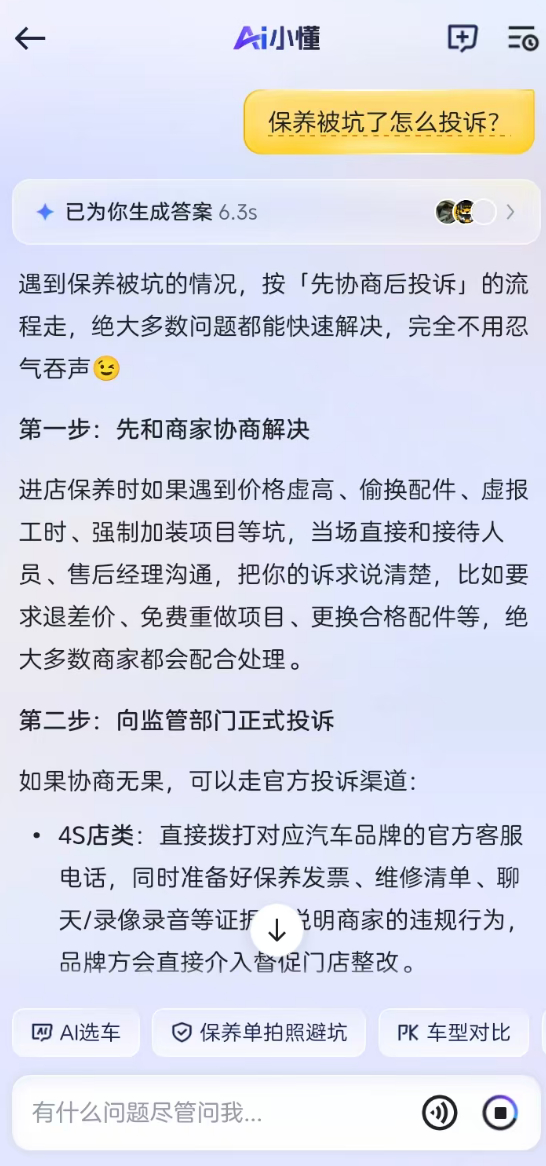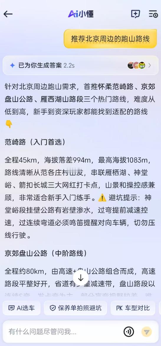 不过,这还不是最重要的,最重要的是有了这个AI小懂,关于车,基本可以万事不求人了。具体来说就是,用车、选车、买车、卖车、玩车,一站式搞定。就拿我自己来说,首先是对长期用车,小懂可以给你智能分析保养单,智慧避坑了属于是。选车方面,自带车展专项知识库,还能车型深度对比,你平常问不出口的“某车和某车,到底谁更厉害”,自动就给你出答案。关于买车,他甚至是能自己去给你砍价的,给你自动生成报告。甚至是卖车,你输入车型等等数据,他就能给你估价。玩车方面,自动给你推荐跑山路线,给你的赛道生涯指南,还给你提供安全注意事项。真是兜里随身揣着一个车圈大佬。你的AI买车军师亮相北京车展