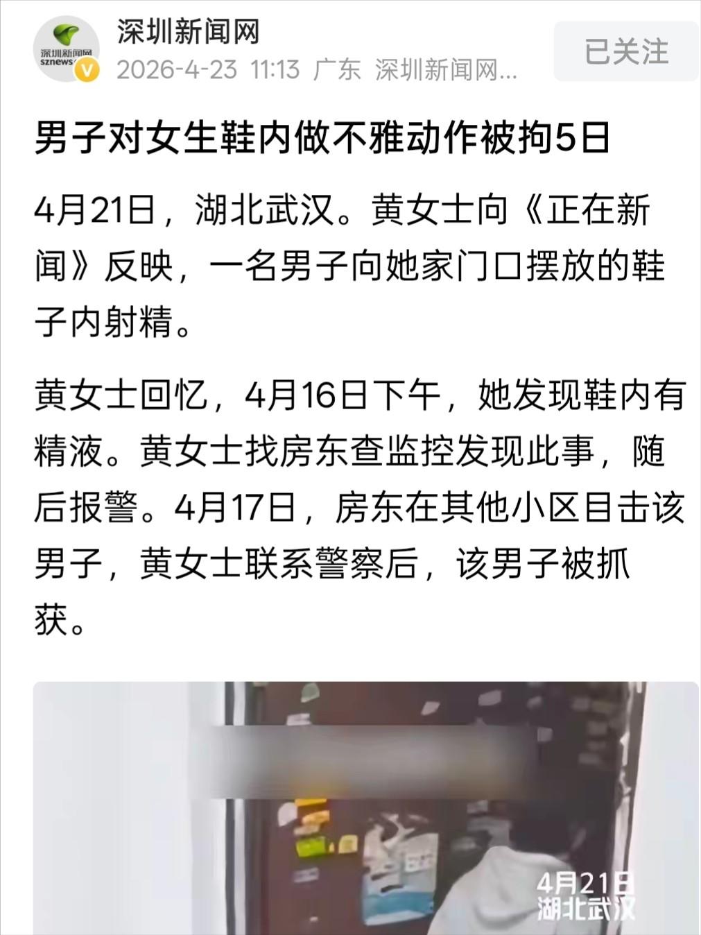 太变态了!湖北武汉,20岁年轻男子垂涎女邻居的美色,不能得手,竟然对她的鞋子下手了。男子对着女邻居的鞋子做出不雅动作后,还把灌满体液的鞋子光明正大地摆放到女邻居家门口。女邻居发现后,崩溃不已,报案了,男子被拘留了5天。更令女邻居崩溃的是,男子表示自己穷的很,拒绝赔偿! 今年4月16日,武汉的黄女士准备出门,随手拿起门口那双精致的高跟鞋。 手指刚碰到鞋内,一阵黏腻的触感让她整个人僵住了——鞋子里有一滩白色黏稠液体,散发着刺鼻的腥臭味。 事发当下,黄女士整个人都难以置信。 平日里她和邻里都习惯将鞋放置家门口,长久以来一直平安无事。可如今自己价值不菲的高跟鞋惨遭恶意玷污,她浑身止不住颤抖,整个人毛骨悚然。 监控还原了真相。 监控录像记录下全程:一名二十岁出头的青年在楼道内反复徘徊张望,仿佛在伺机等候。 他数次在黄女士家门口驻足、折返,确认周边无人窥探之后才蹲下身。随后他拿起高跟鞋,做出了极度低俗不雅的行为,结束后淡定将鞋子将鞋子放回原位,从容嚣张地扬长而去。 整个过程清清楚楚。这不是一时冲动,而是经过完整预谋的犯罪。 黄女士没有丝毫犹豫,第一时间向公安报案。 等到第二天下午,房东在隔壁小区意外发现男子身影,警方随即开展抓捕行动,顺利将董某抓获归案。这名 20 岁的无业青年,对自己全部恶劣行径坦白认罪,最终被认定寻衅滋滋事,处以 5 天行政拘留。 5天。就5天。 很多人觉得这个处罚太轻了。 按照《治安管理处罚法》,任意损毁公私财物可处5到10天拘留,董某拿的是下限。 有人援引法律第44条"猥亵他人"条款,认为应该重判,但"猥亵"通常指向人体,本案针对的是物品,法律适用存在模糊地带。 更让黄女士崩溃的是,董某自称没收入,拒绝赔偿。 行政拘留解决了"惩罚"问题,但解决不了"赔偿"问题。黄女士如果想追偿,得等拘留执行完毕后另行提起民事诉讼——维权成本太高了。 舆论场上,除了谴责董某,还出现了另一种声音:"鞋子放门口会不会太招摇?" 这话听起来像是在关心黄女士,实际上是把受害者的生活习惯预设成"招惹犯罪"的理由。可犯罪行为的发生,根源在于行为人的道德沦丧和法律意识缺失,而不是受害者把鞋子放在哪里。 "相安无事"本应是常态。董某的越界,才是打破这种常态的唯一变量。 从心理学角度看,董某的行为是典型的"恋物癖"表现——通过接触异性物品获得性满足。 但与传统恋物癖不同,本案涉及对他人财物的污染和人格侮辱,已经超出了单纯的个人心理异常范畴。 这双鞋还能不能穿?有人说洗洗还能穿,可心理上肯定过不去。黄女士以后还能住在这里吗?她想不通,也不敢想。 董某今年才20岁,前途还长着。但愿这5天能让他真正悔改,重新做人。只是,5天够吗? 案源:深圳新闻网