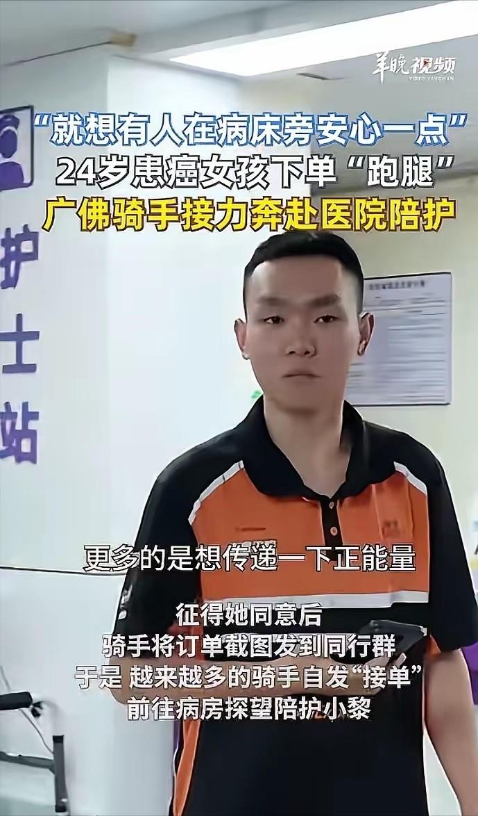 广东佛山,一外卖骑手接了个跑腿单,不料,订单备注里的要求却格外反常:“不用取送东西,就来病床旁陪我两小时,让我安心一点。”骑手抱着疑惑赶到病房,推开门的瞬间,整个人都愣住了! 午后阳光笼罩着佛山,董师傅定定注视着手机屏幕,足足愣神十秒钟之久。 订单备注内容直白明了:不需要帮忙接送搬运任何物品,只需要来病床边陪伴自己两个小时,缓解内心的不安。酬劳为五十元,接单地点就在周边的肿瘤医院内。 他短暂迟疑了数秒之后,最终还是按下了接单确认按钮。 当他推开 30 号病床所在的病房房门,整个人瞬间怔住。 病床上躺着一位二十岁出头的年轻女孩,发量稀疏,面色惨白毫无血色。 女孩小黎费力挣扎着想要坐起身,强撑着挤出一抹笑意,哽咽说道:师傅,真的不好意思,我的家人全都远在外地,我独自一人面对手术,实在太过恐惧无助了。" 24岁,湖南永州人,鼻咽癌。父母在老家种地,身体不好,还要照顾年迈的爷爷奶奶。她怕家人担心,硬是一个人扛下化疗和检查。那天要做增强CT,按规定得有人陪同签字,化疗后遗症让她怕得要命,空荡荡的病房里越想越怕,实在没办法才下了这个单。 董师傅没有过多言语,只是安静地拉过一把椅子,在病床边上静静落座。 接下来的两小时,整个病房都笼罩在安静之中。 小黎时不时咳嗽,他总会及时上前帮忙操作呼叫铃、递上温热的饮用水。 她几乎全程沉默,时常盯着天花板走神放空,他从不主动追问打扰,只在一旁将手机静音、调低音量,默默陪在一旁。 后来小黎坦言,那是她住院治疗这段时间里,唯一一个睡得安稳又安心的午后。 离开时,董师傅掏出手机要把钱退给她。小黎死活不收:"这是你的辛苦费。董师傅连连摆手推脱,称自己只是刚好顺路,让她收下钱多补充些营养好好休养。" 回去后,董师傅把订单截图发到广佛骑手交流群,随口说了句:"30床那个独自化疗的小姑娘挺可怜的,路过的兄弟们有空去看看她。" 群里瞬间炸开了锅。 第二天,一个刚下夜班的年轻小伙子拎着两盒牛奶来了,坐在床边给小黎讲跑单遇到的奇葩事,逗得她差点笑出声。 第三天,来了个大姐,带着几个自家煮的鸡蛋,教她怎么缓解化疗的恶心。 来到第四天,这间病房的 30 床位,俨然成了大家口中温暖的骑手爱心驿站。有的骑手订单还没全部配送完成,楼下电动车车灯还在持续闪烁,就先上楼进病房看望女孩。 还有人为了专程前来陪伴,特意调整了自己的工作班次,揣着便携折叠毯和舒适靠枕匆匆奔赴。甚至有广州的骑手师傅,凌晨四点多才值完通宵夜班,衣服都来不及更换,就第一时间赶往医院。 大家心照不宣,从不多问病情细节,也不打听家事。就坐在那里刷手机,或者聊两句天气、跑单见闻。 这不是偶然的善意爆发,而是一场精准的"信任博弈"。董师傅面对未知订单,在"可能是恶作剧"和"可能真有人需要帮助"之间权衡,选择了承担微小成本去验证。他赌赢了。 骑手群里,一个订单截图加一句话,就是可流通的"信任证明"。 每个后续骑手的来访,都在给这份社交货币充值。"不问病情、不打听家事"——这种保护性沉默降低了参与门槛。 骑手们不需要"做大事",只需要"来坐坐",边际成本极低。结果就是参与者越来越多,形成正向循环。 增强CT需"陪同签字"的医疗规定,撕开了城市孤岛化的一道口子。 无数像小黎这样的"漂一族"离开原生家庭,尚未建立本地社会网络,一旦患病就陷入"无陪伴签字"的制度性障碍。跑腿单成了民间自发填补制度空白的应急方案。 后来医院也减免了小黎部分费用。 这不仅是同情,更是一种制度反思——如果无法修改"陪同签字"规定,至少可以在费用上松绑。 报道出来后,佛山本地网友自发去医院送物资。小黎病情稳定后向父母坦白,父母赶到佛山看到病房里来来往往的骑手,当场鞠躬哭着致谢。 小黎白细胞指标上升,精神状态好转,已经顺利出院回家调养。她说以后要像这些骑手一样帮助需要帮助的人,把温暖传递下去。 从"一次订单"到"一场运动",需要的不过是一个足够"反常"的订单备注打破常规认知,骑手群内实时反馈制造情绪共振,再从骑手圈扩散到本地网友、全网。 "轮流排班"将一次性善意转化为可预期的制度安排,"跨城送米粉"用乡愁连接填补情感空洞。 这些穿黄衣蓝衣的陌生人,每天在城市里奔波,为生活拼尽全力。 可面对别人的苦难,他们二话不说就伸出手。 每一个"来坐坐"的微小动作,都在撬动更大的社会议题。 这世界不缺好人,缺的是发现善意的眼睛。 信源:羊城晚报