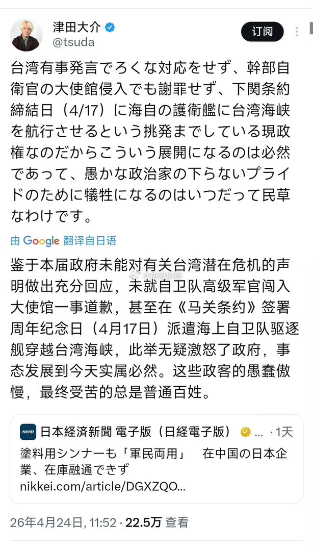 日本知名记者津田大介昨天(4月24日)写道:“面对台湾有事的言论,该政权毫无应对措施;未就自卫队高级军官闯入大使馆一事道歉;甚至在《马关条约》签署周年纪念日(4月17日)派遣海上自卫队驱逐舰穿越台湾海峡,此举无疑激怒了政府,事态发展到今天实属必然。这些政客的愚蠢傲慢,最终受苦的总是普通百姓。”【津田大介转发了日经新闻的报道:就连涂料用的稀释剂也被列为“军民两用”——在中国的日本企业因此无法进行库存调拨。】