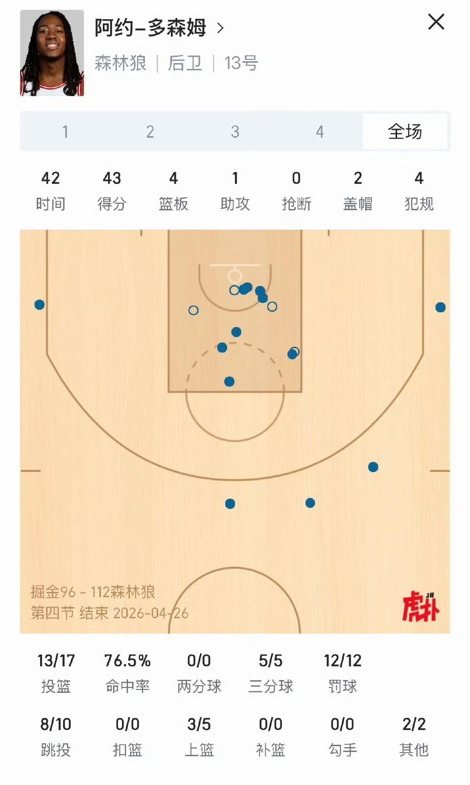 狼灭!替补奇兵43分掀翻卫冕冠军,史上最离谱剧本诞生? 当爱德华兹和迪文琴佐在开场不到两分钟相继伤退,全世界都以为森林狼的赛季剧本已经写完了。然而,一个叫阿约·道苏姆的名字,用一场“疯子般的表演”,撕碎了所有预测,把掘金主场变成了个人封神的舞台。