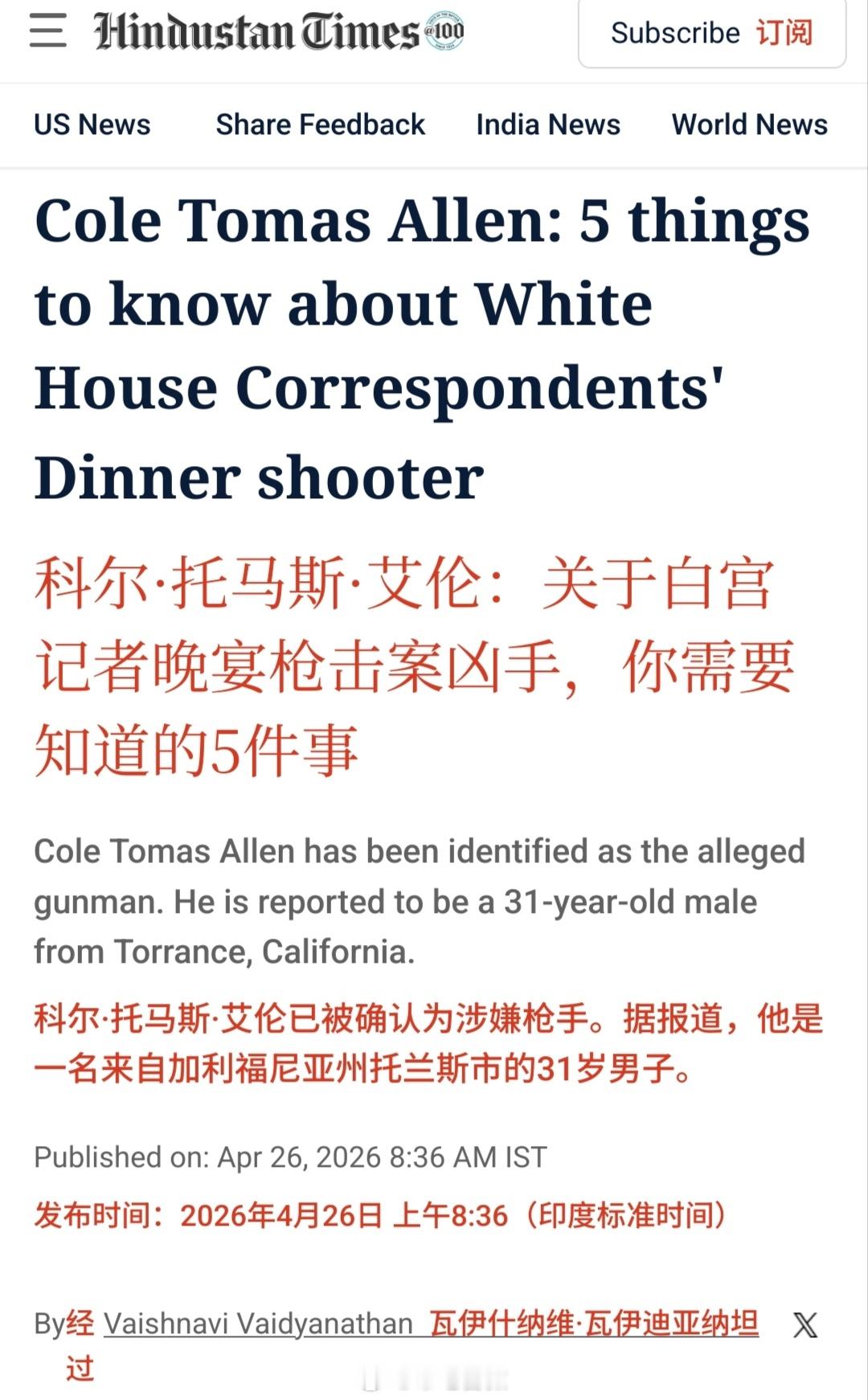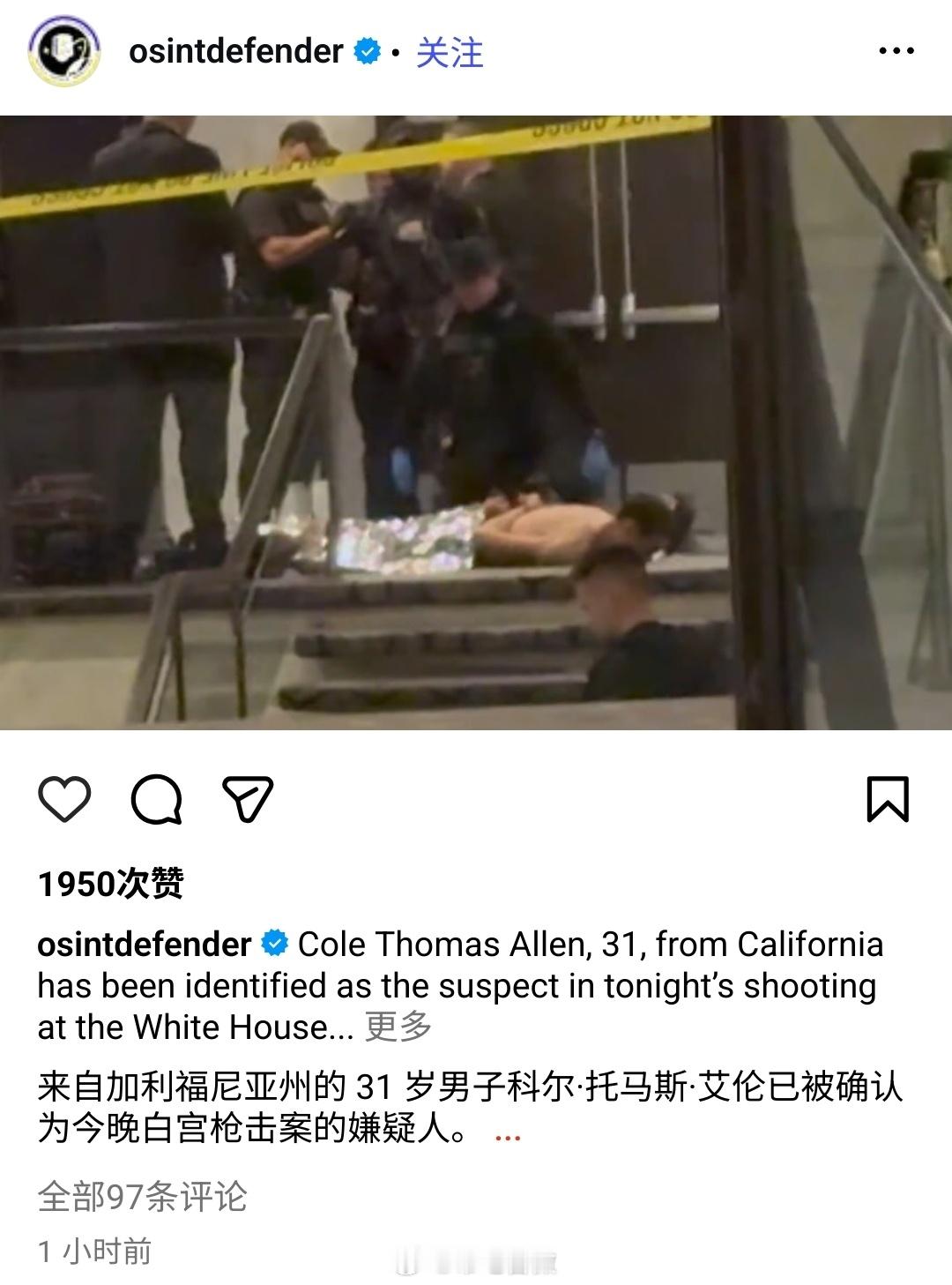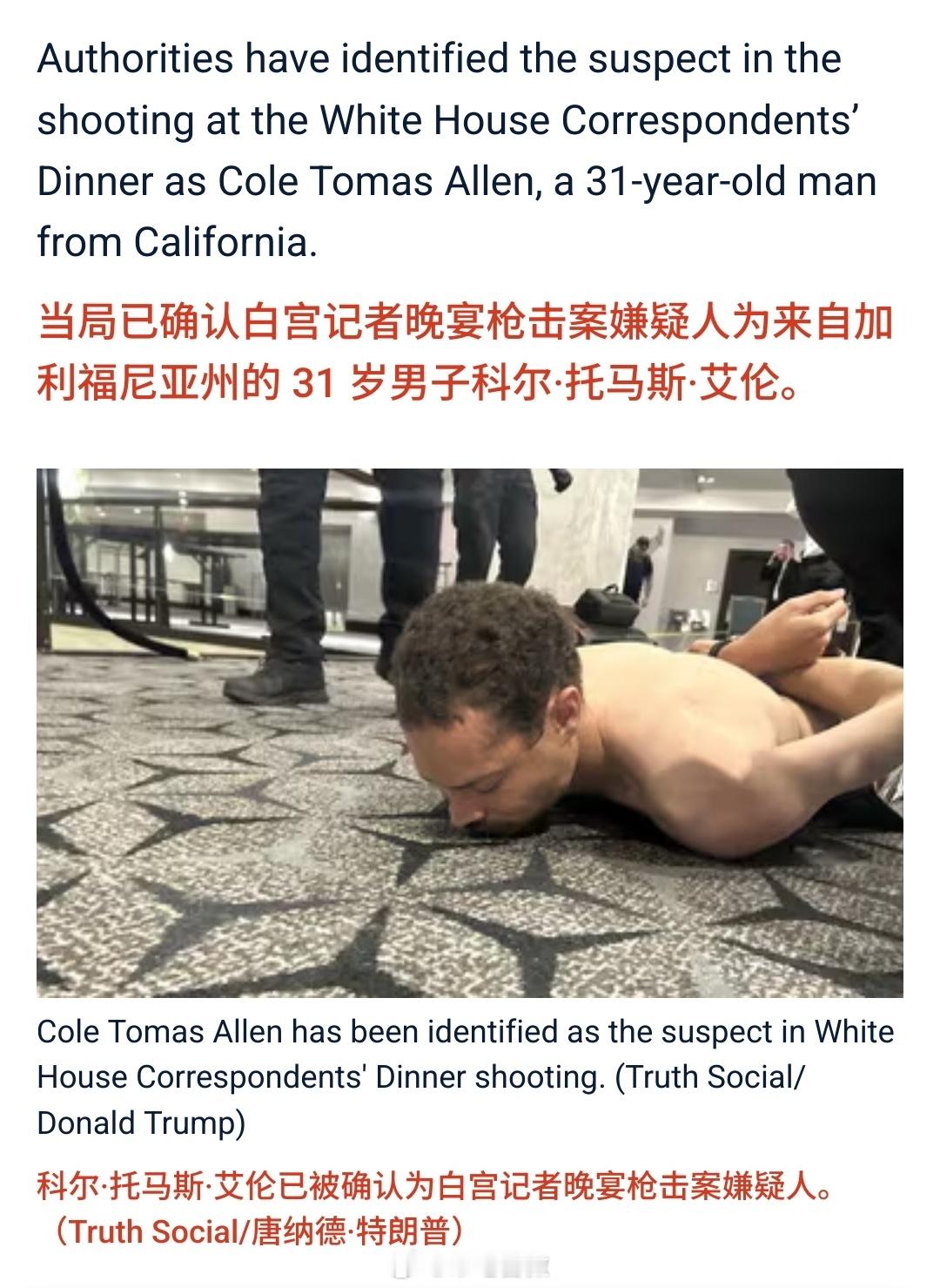 是什么让一位非常优秀的美国人在白宫记者会上开枪?白宫记者协会晚宴的嫌疑枪手名叫科尔·托马斯·艾伦,31岁,来自加利福尼亚州托伦斯市。他曾获加州州立大学计算机科学学士学位,担任教师期间,被评为"洛杉矶县月度优秀教师"。特朗普公布枪手强闯安检录像特朗普因安全原因离开白宫晚宴