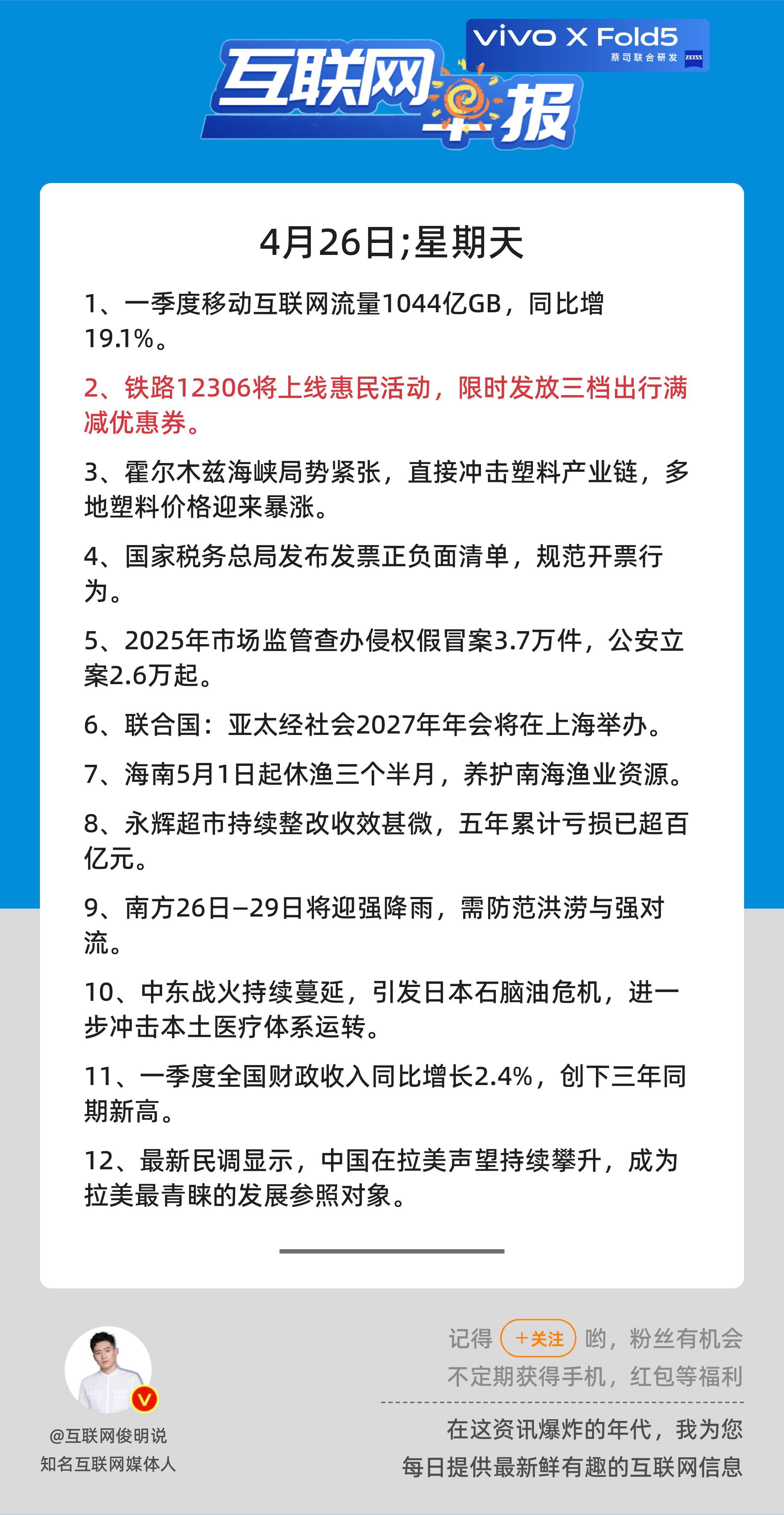 4月26日,星期天,《第3120期》;互联网早报,众览天下事关心第2条:铁路12306将上线惠民活动,限时发放三档出行满减优惠券;早安————————————点击右上方关注每天一分钟众览天下事,互联网早报值得拥有! 更多精彩,欢迎加入粉丝群俊明和他的朋友们