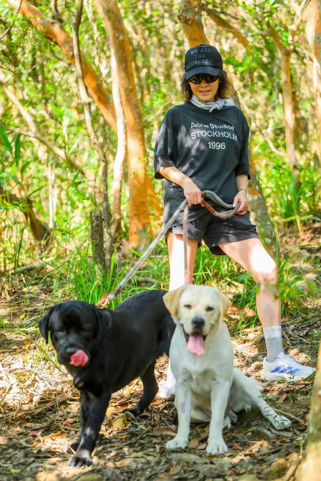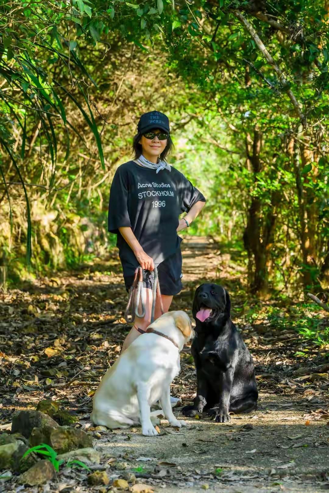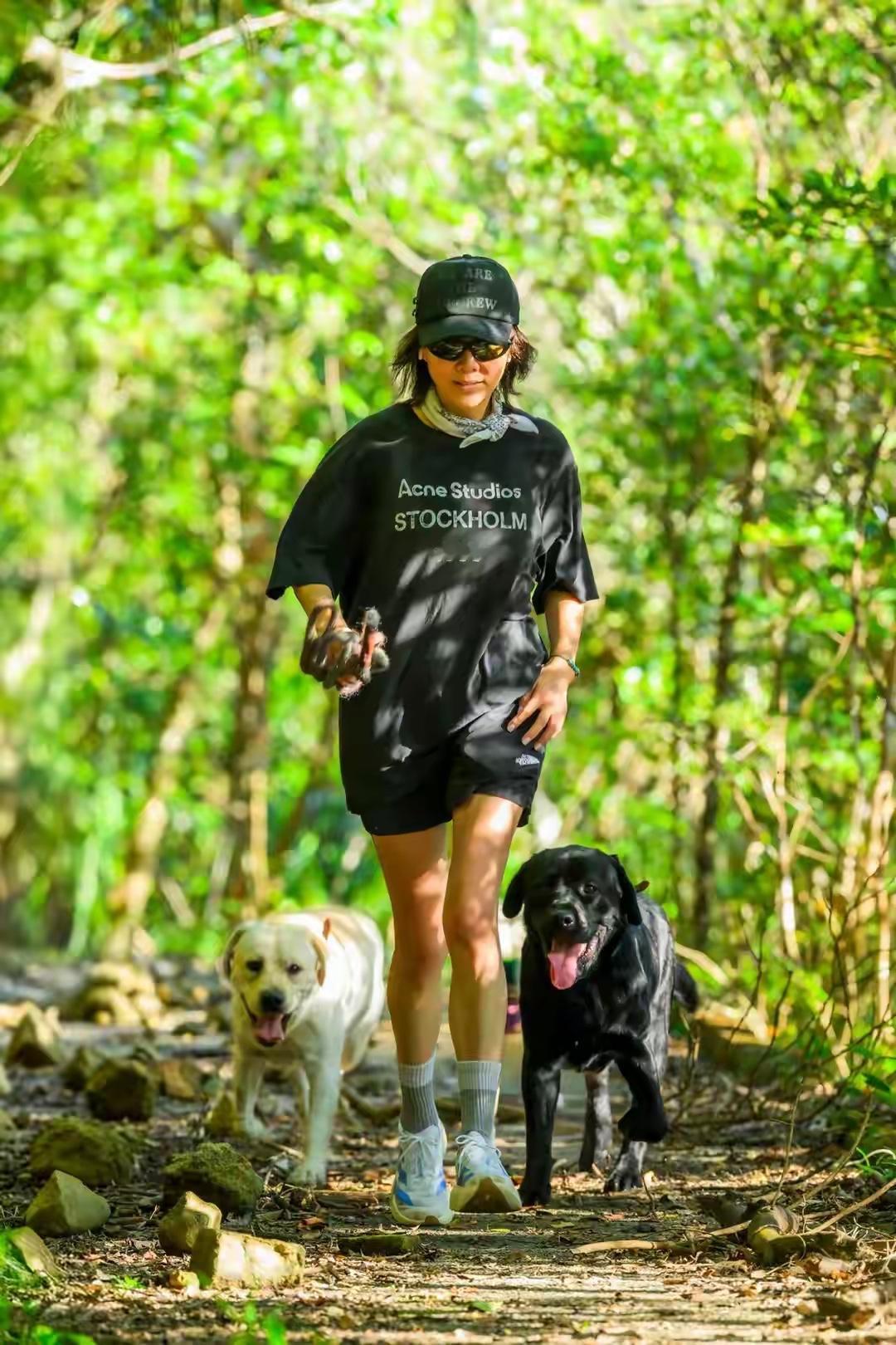 刘嘉玲的这一身搭配看着非常简约利落,特别是上半身的黑T,宽松的版型自带随性氛围,落肩版型还弱化了中年女人的臃肿感,微胖女人可以大胆尝试,下半身搭配同色系运动短裤,利落又藏肉,完美适配户外遛狗、散步的场景,舒服又自在。