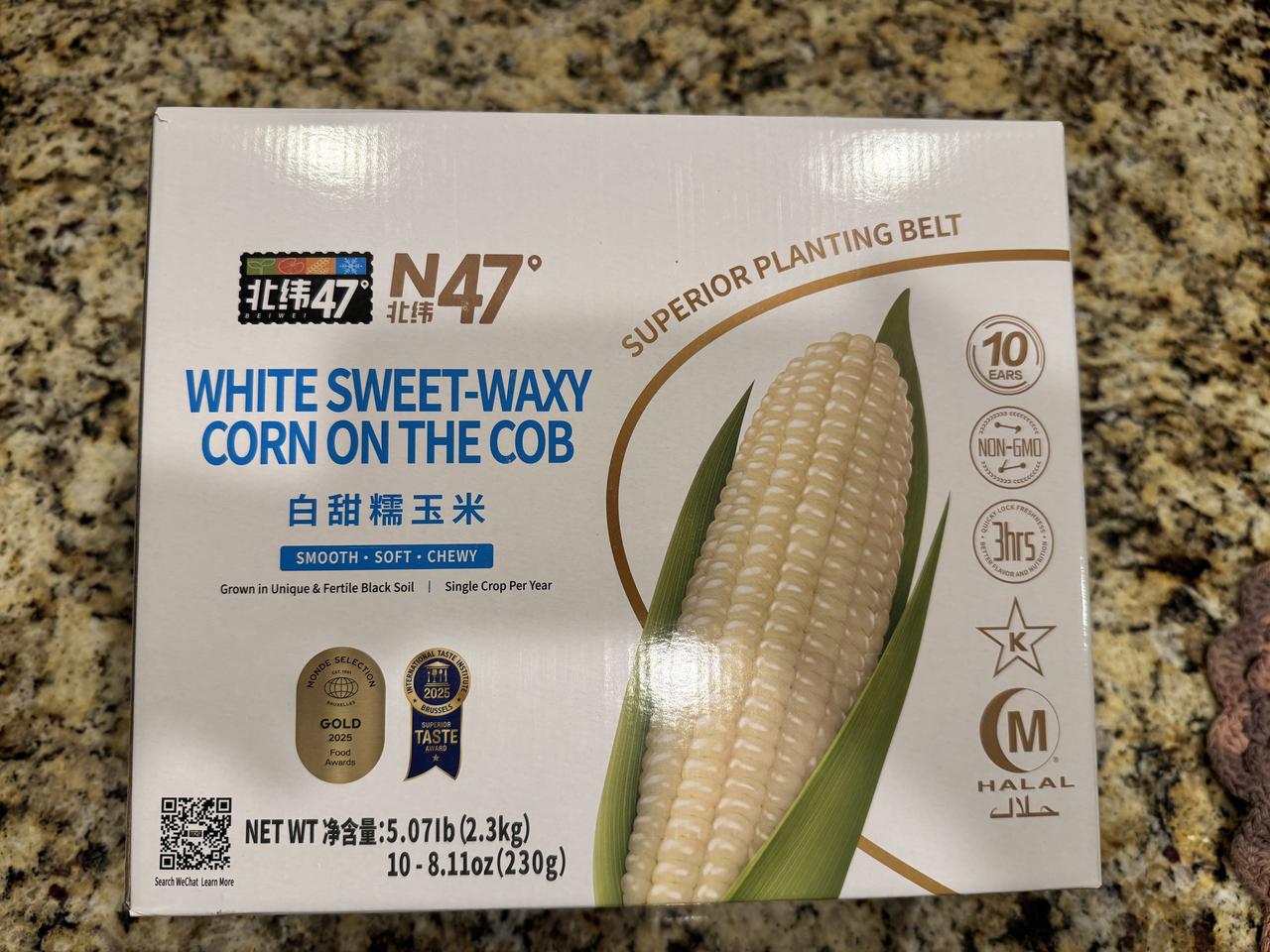 一箱十穗的中国产玉米在美国卖多少钱? 17.99美元,加上税,折合每根苞米13块多人民币。 中国玉米能卖到盛产玉米的美国,已经是够神奇的了。 还能卖高价,还能让我家无限复购,这真值得特别夸一夸。 源自北纬47度,应该是黑龙江中部吧,那里有广袤的黑土地。 想念在三江平原的岁月,虽然那时吃到的苞米,远没有现在这箱甜糯玉米香甜。