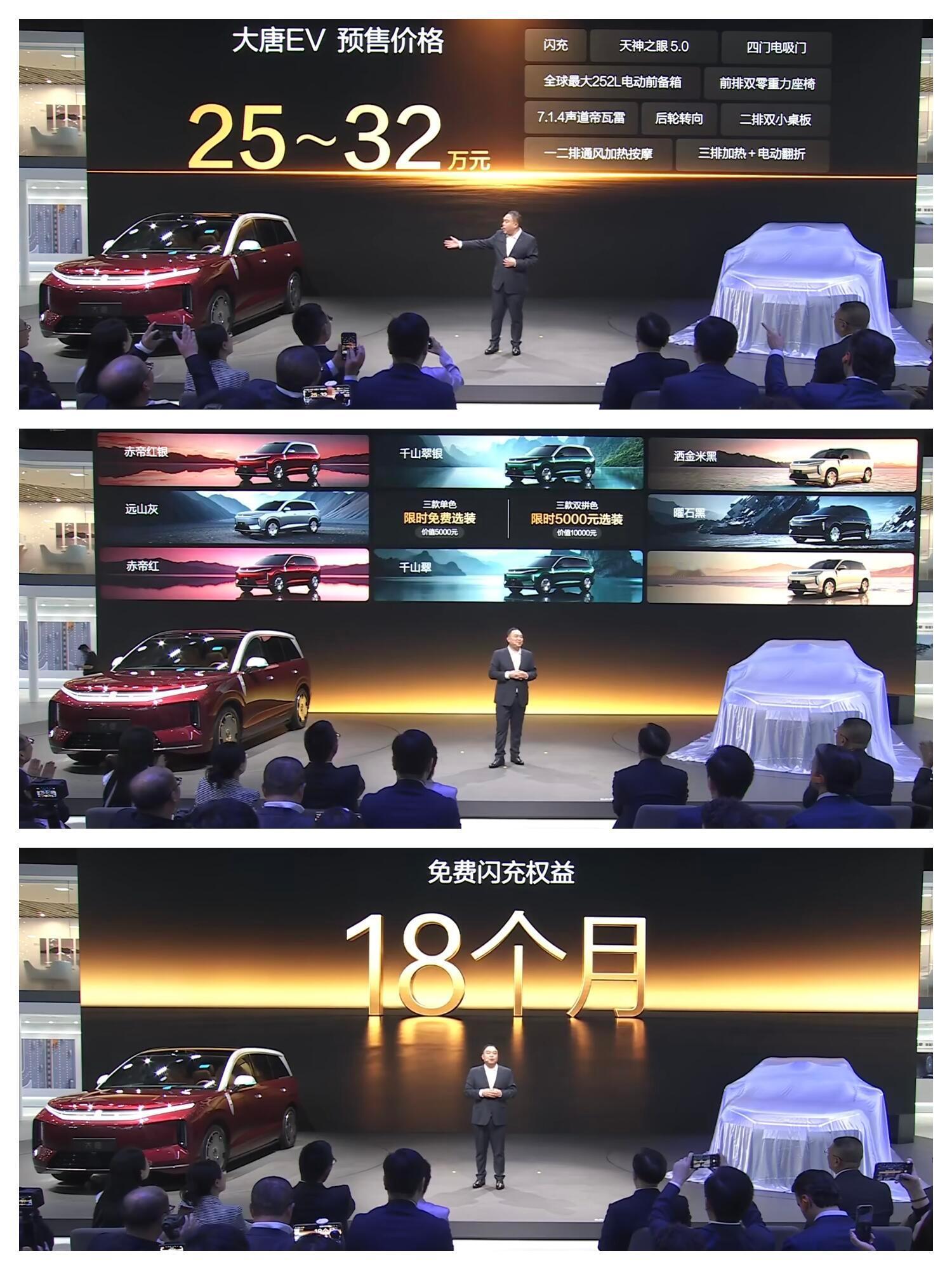 比亚迪大唐EV预售价公布,25万至32万,纯电版有800km后驱、950km后驱和850km四驱三个版本。比亚迪唐
