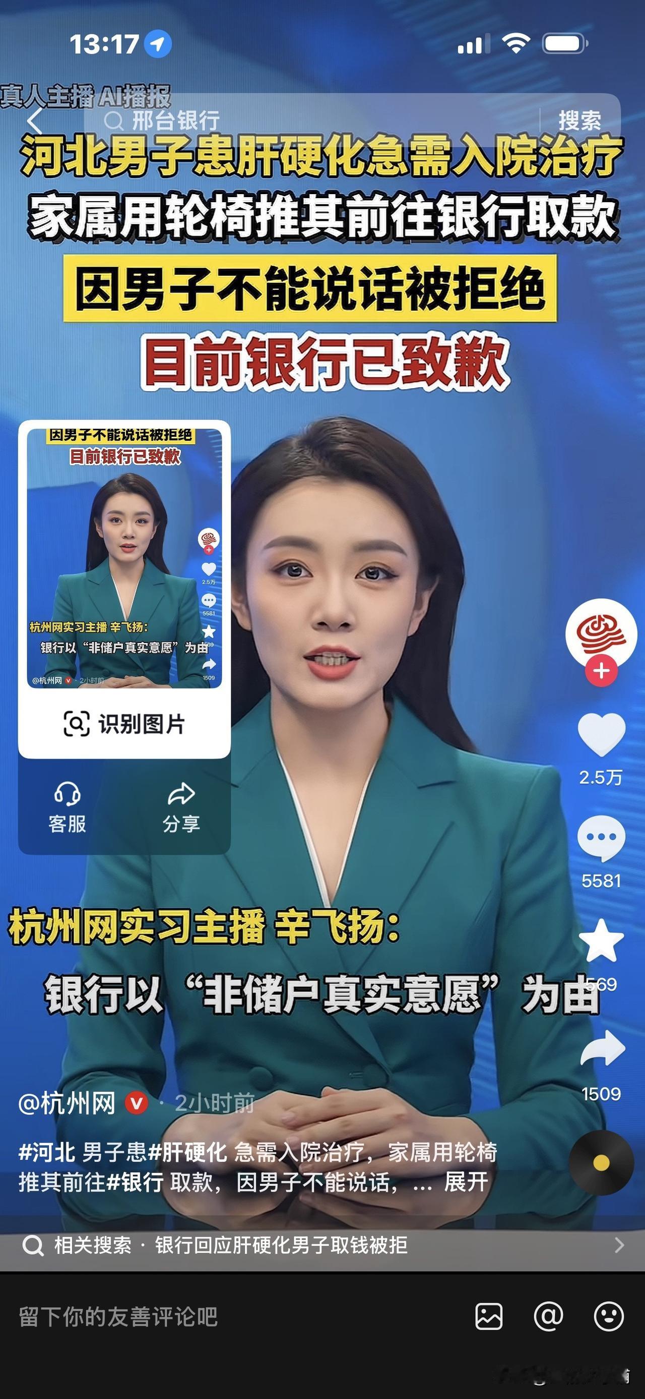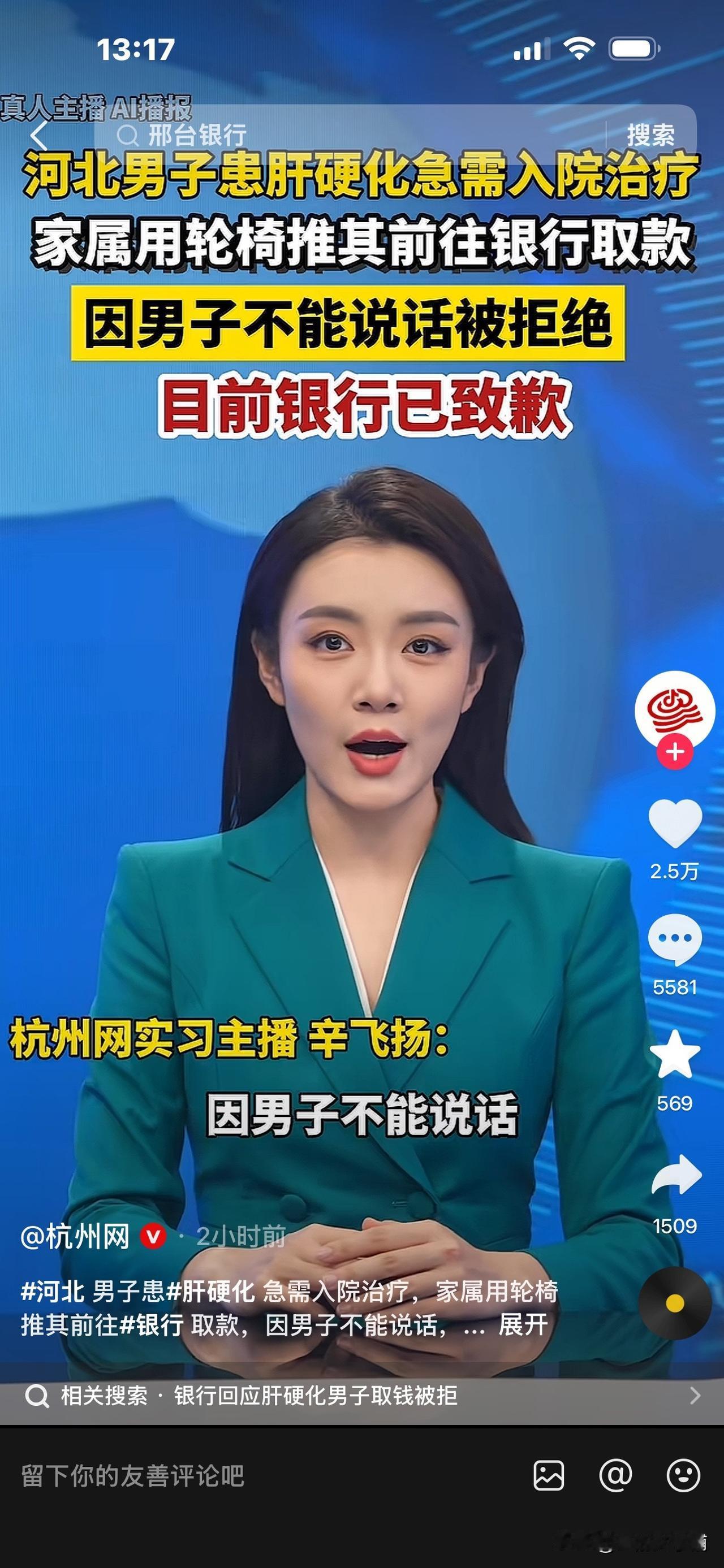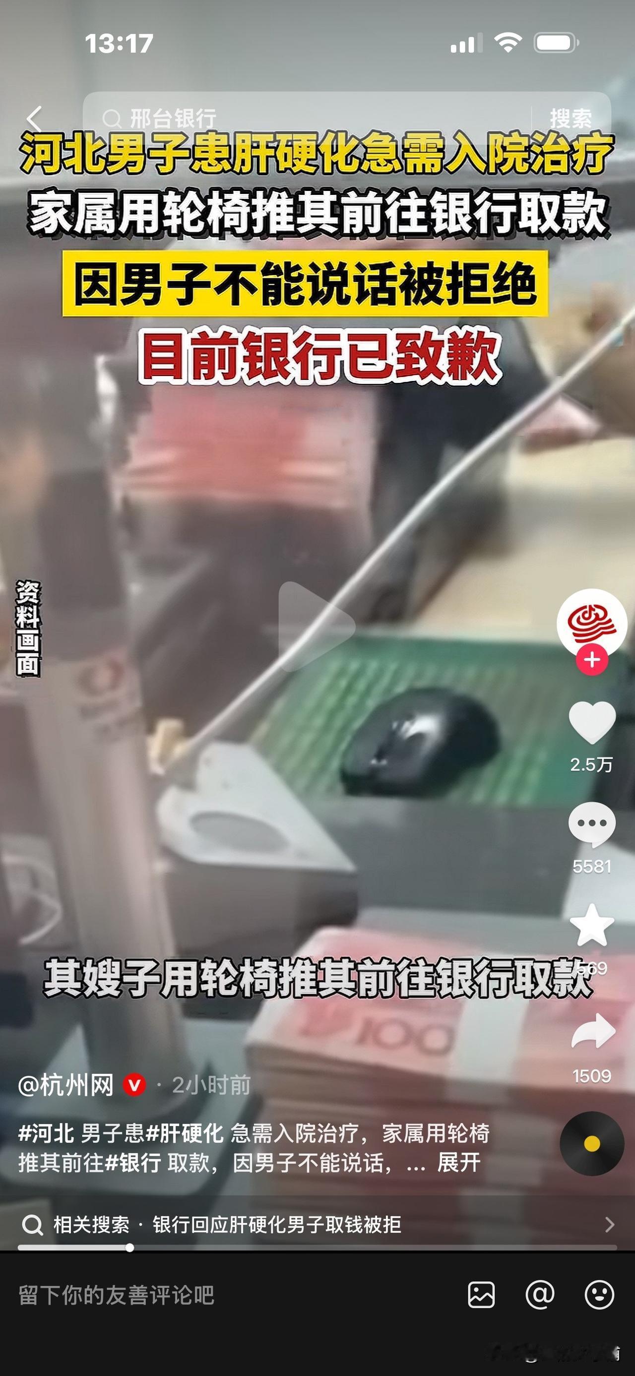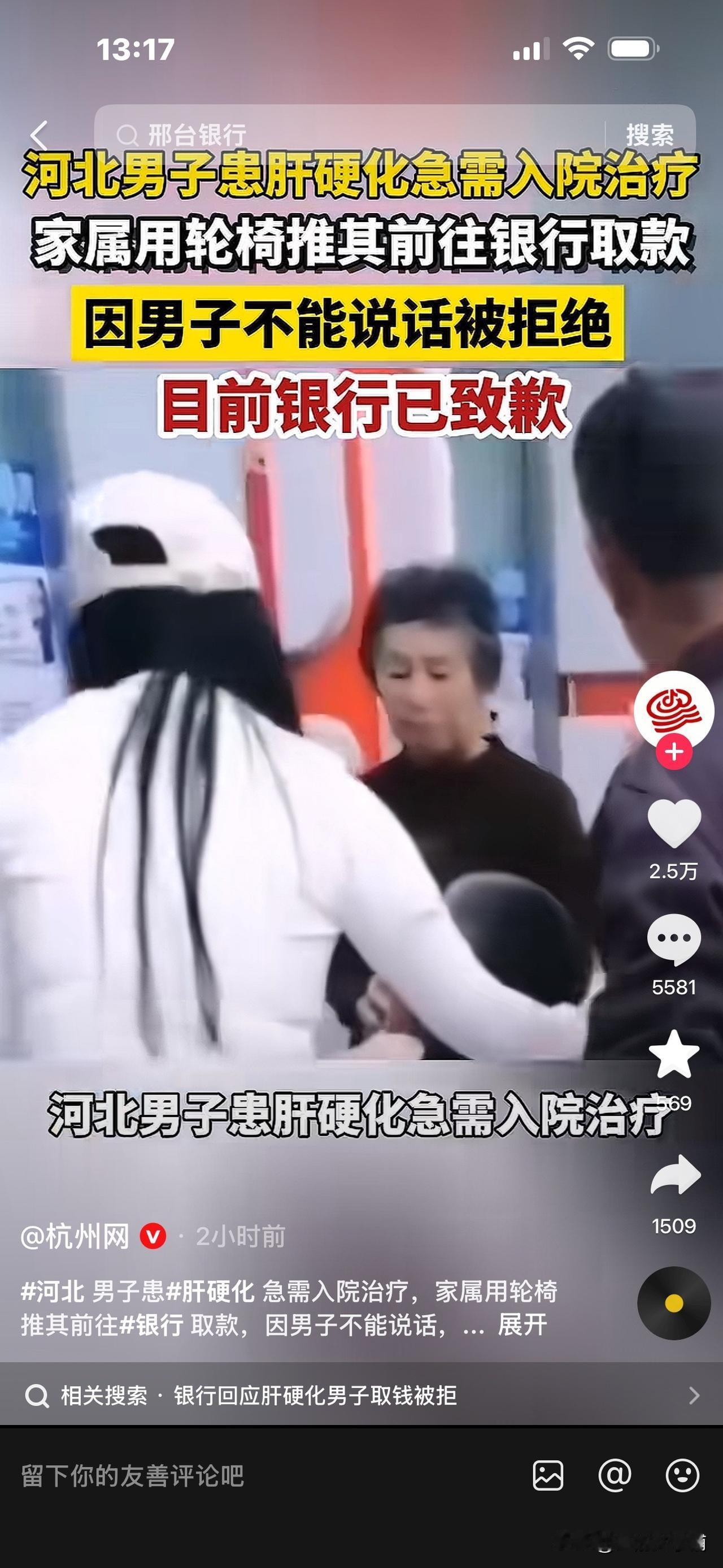 女子用轮椅推小叔子去银行取钱,被拒! 对方说:他嘴角流血,人都快没气了 还抬来,这是什么事! 近日,河北一女子,用轮椅推着患肝硬化的小叔子去银行取钱,以便给他治病。 小叔子状况很不好,患有肝硬化,无法行动,无法说话,病情很严重,自己没办法去银行取钱。 但现在要急着上医院,急需用钱。 女子曾带上小叔子身份证帮他去取,被拒绝。 之后,女子没有办法,只好用轮椅推着精神萎靡,昏昏沉沉的小叔子去取钱。 但是这次到了柜台,工作人员又说: “你看他嘴巴都流血了,人都快没了,还推来干什么。你要取钱,他又不能说话,又不能表示,我们也没办法确定是不是他的真实意愿,再说你也不是他的直系亲属。”(大意) 所以再次拒绝办理取款业务。 女子很无奈,很生气,只好把这个事件公布出来。 之后,记者打电话给当地银保监分局说明了此事。 4月25日,该女子表示,已经办妥了取款,也收到了道歉,对此事的结果还是满意的。 评论区里网友们的意见不一致: 有人认为,银行太多事了,自己的钱放进去还取不了,太糟心了,以后谁信它呀。 但也有人认为,现在诈骗事件频发,银行监管很严,它们有自己的一套规定。 王女士小叔子这种特殊的情况,虽然身份信息核实对得上,他不能表达自己的意愿,取款金额可能还比较多,银行为了保护王女士小叔子的存款不被他人骗取侵占,谨慎还是有一定道理的,也不能完全怪银行多事吧。 大家对此事怎么看呢? [祈祷][祈祷]